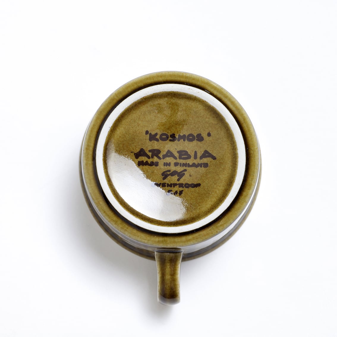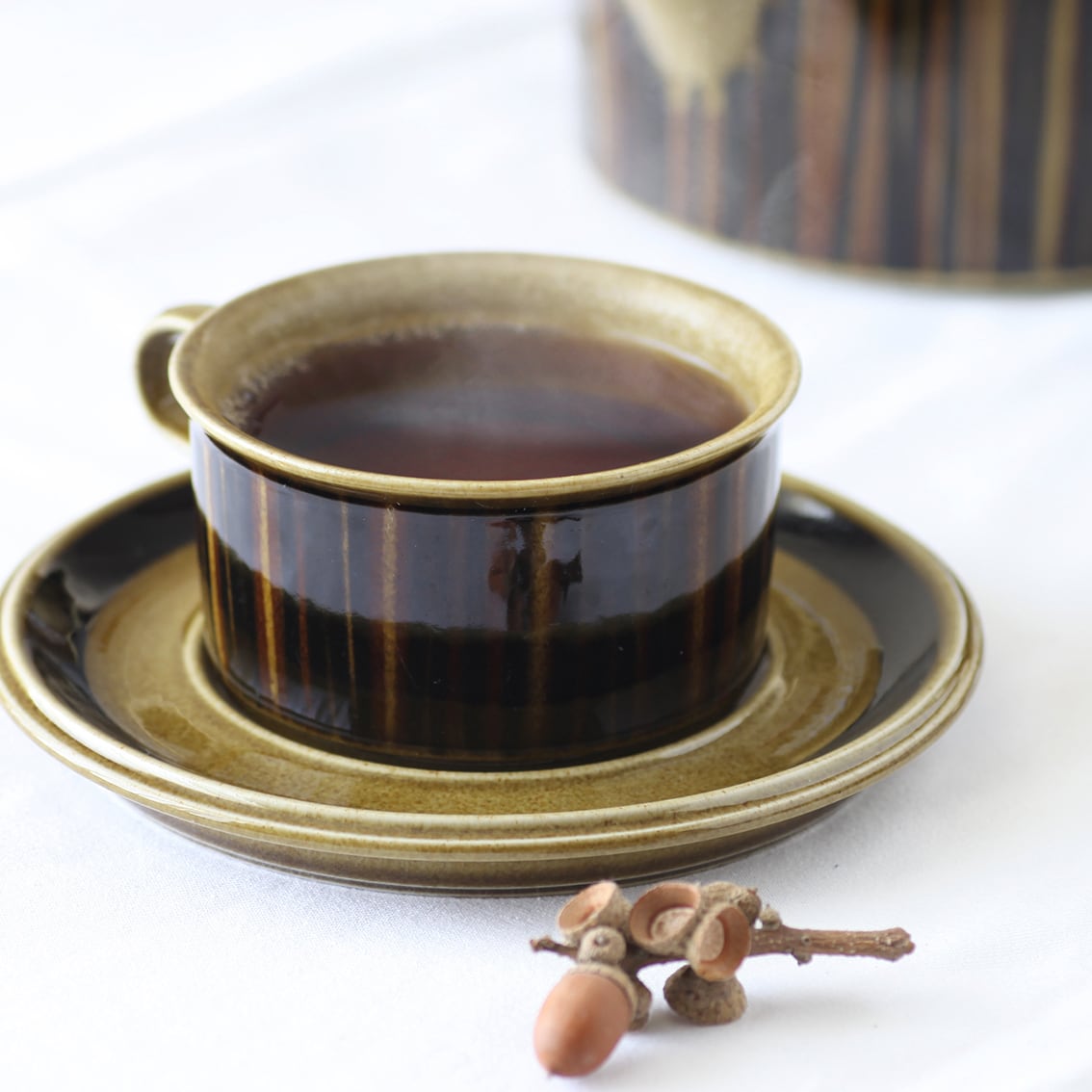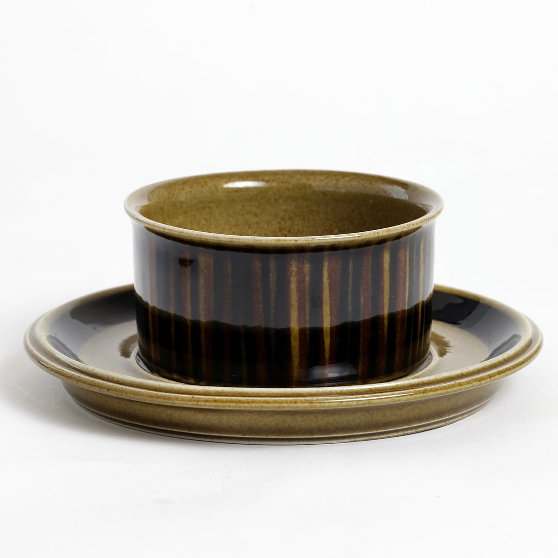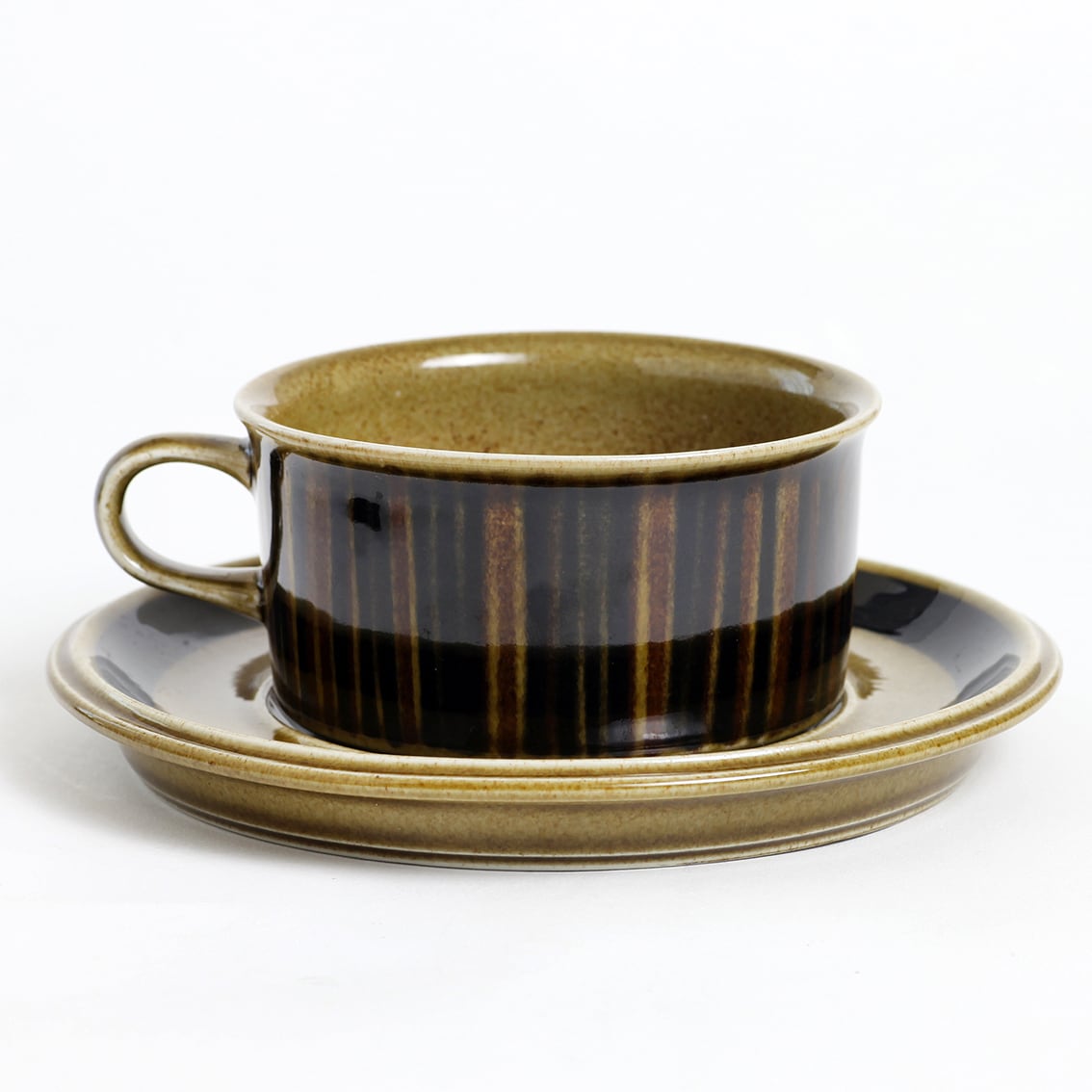 デザインはグンヴァル・オリン・グラングヴィスト。オリーブブラウンの地にランダムな縦のストライプが手描きされており、ソーサーは花のように見えます。フォルムデザインはウラ・プロコペ。コスモスシリーズは2色展開で青も作られました。こちらは落ち着いた色調で温かみのあるブラウン系です。