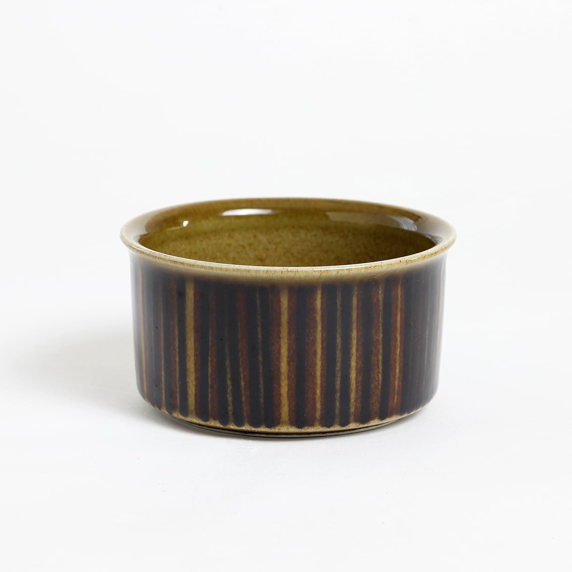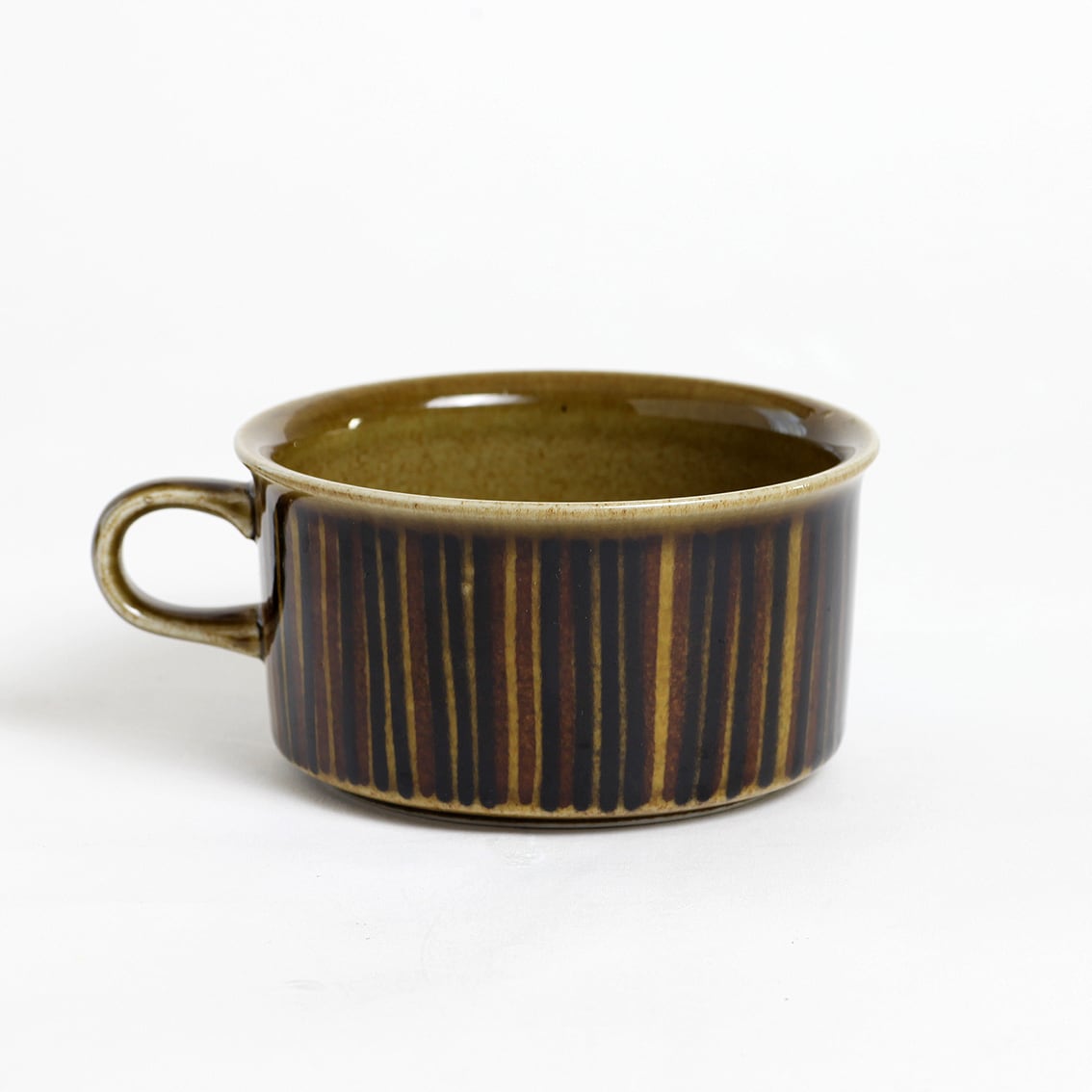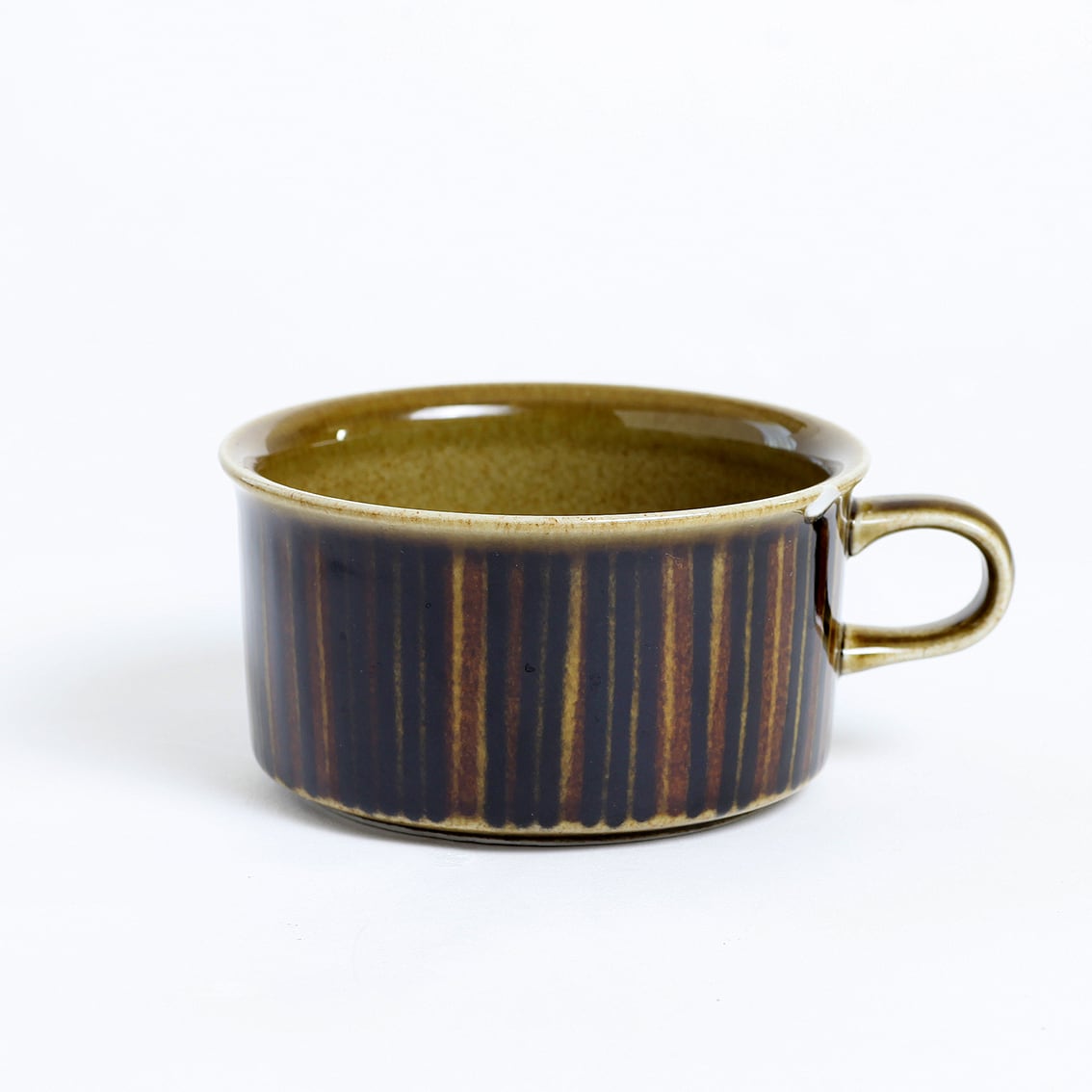 デザインはグンヴァル・オリン・グラングヴィスト。オリーブブラウンの地にランダムな縦のストライプが手描きされており、ソーサーは花のように見えます。フォルムデザインはウラ・プロコペ。コスモスシリーズは2色展開で青も作られました。こちらは落ち着いた色調で温かみのあるブラウン系です。