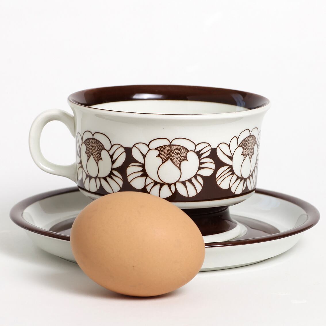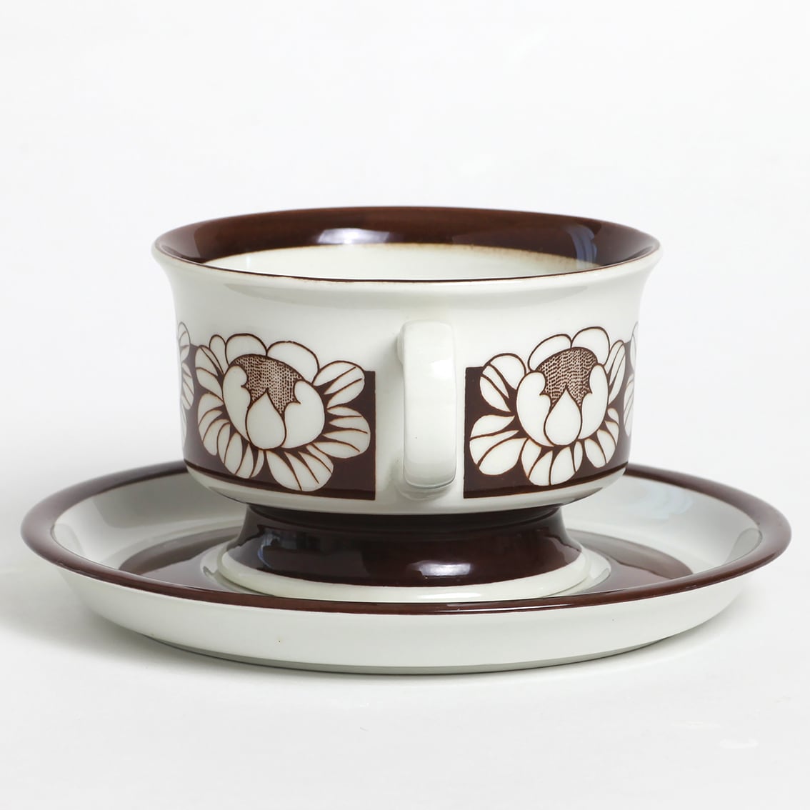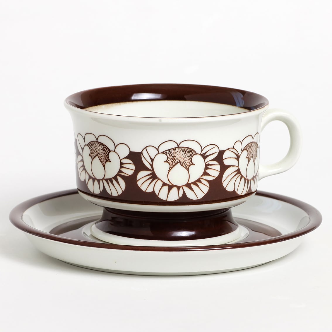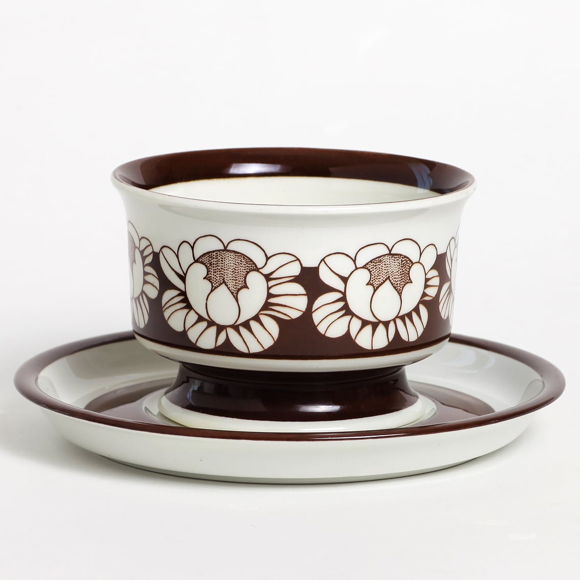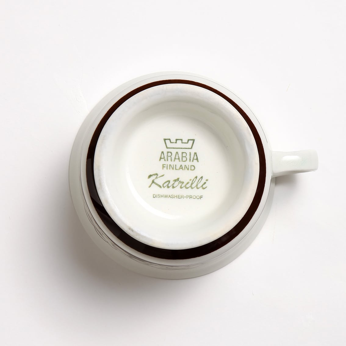 フォルムデザインUlla Procope(ウラ・プロコペ)、デコレートデザインEsteri Tomula(エステリ・トムラ)によるKatrilli(カトリッリ)シリーズのティーカップ&ソーサーです。フィンランドの民族舞踊を意味するKatrilli(カトリッリ)。蓮の花でしょうか、水面で輪になって踊っているようです。可愛らしい絵柄ですがシックな色調で落ち着いた印象で大変人気があります。3年間のみ作られた希少なシリーズです。