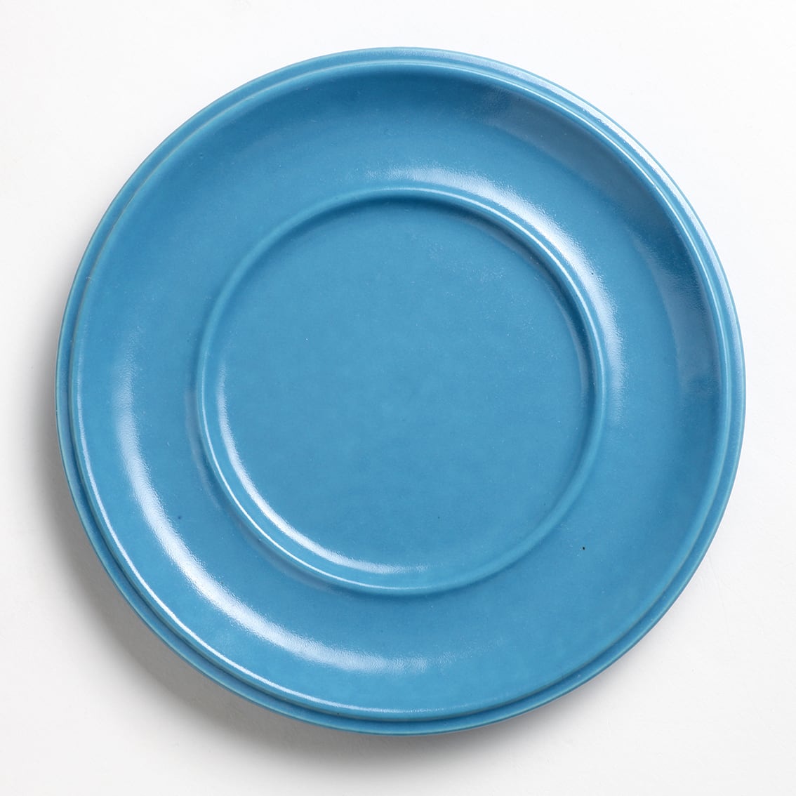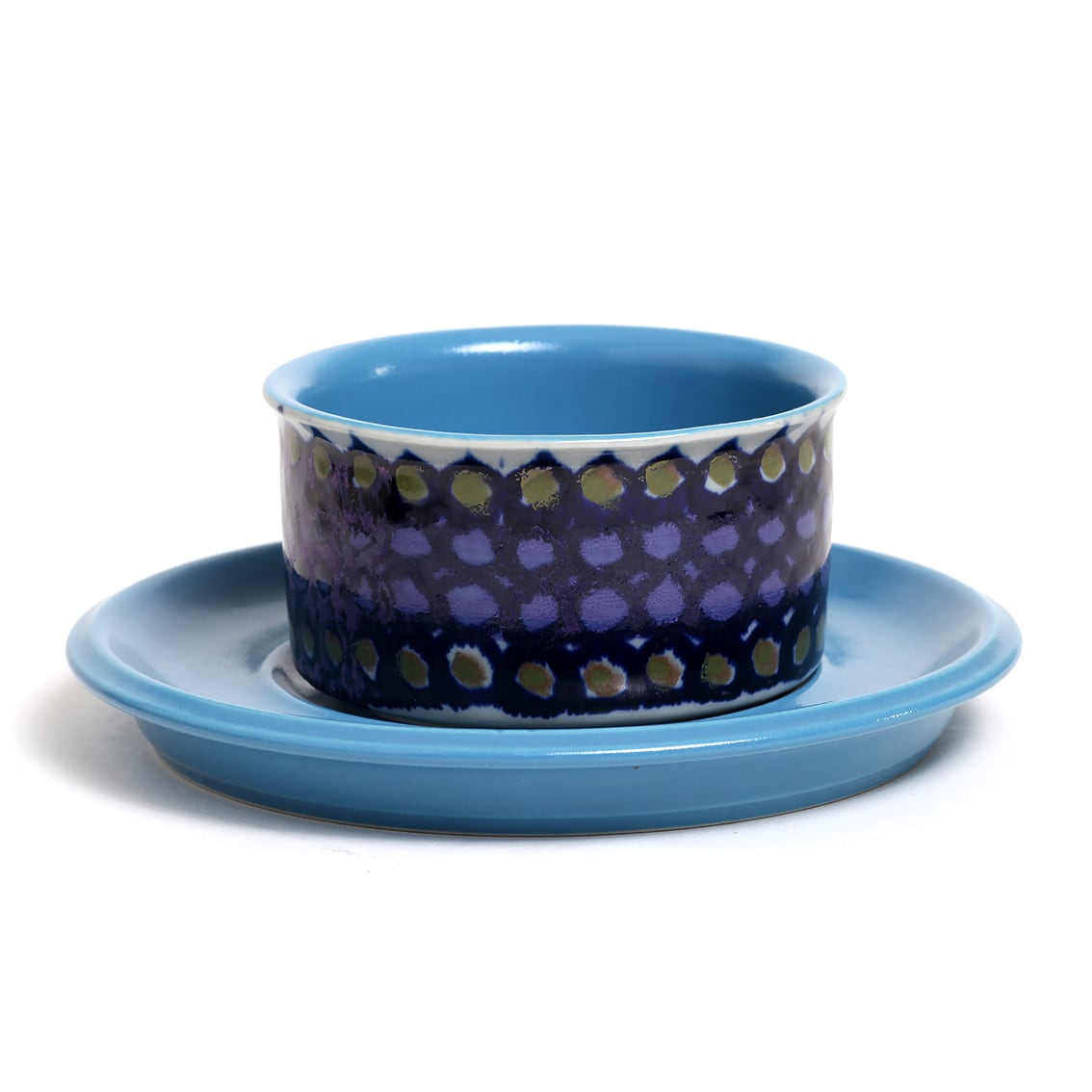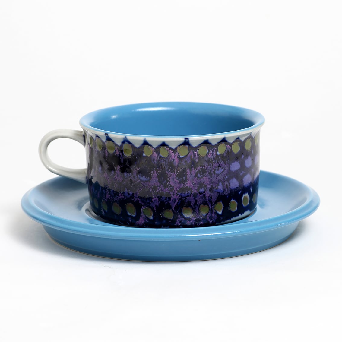 アラビア社(ARABIA)アート部門の Hilkka-Lisa Ahola(ヒルッカ・リーサ・アホラ)が1960年代にデザインしたティーカップ&ソーサーです。1点1点職人が手描きしているため同じものがありません。カップの周囲は緑と青紫の葡萄の実を敷きつめたようなデザイン。カップ内側とソーサーは明るい空色で彩られています。同社のアート部門を代表するデザイナー、ヒルッカ・リーサ・アホラならではの自由な色彩感覚が素晴らしい逸品です。同じデザインでソーサーが紺色のものや鶯色のものも制作されました。