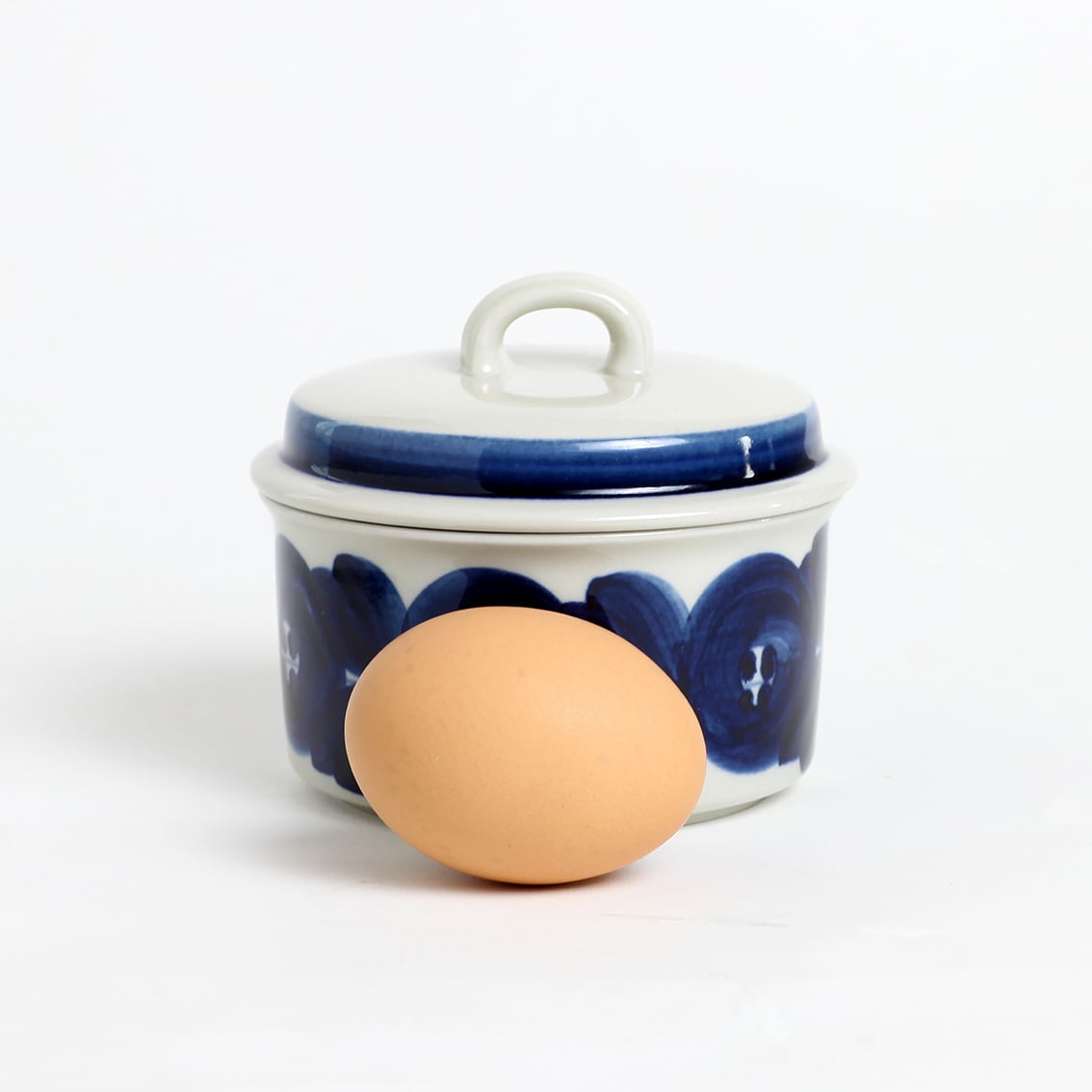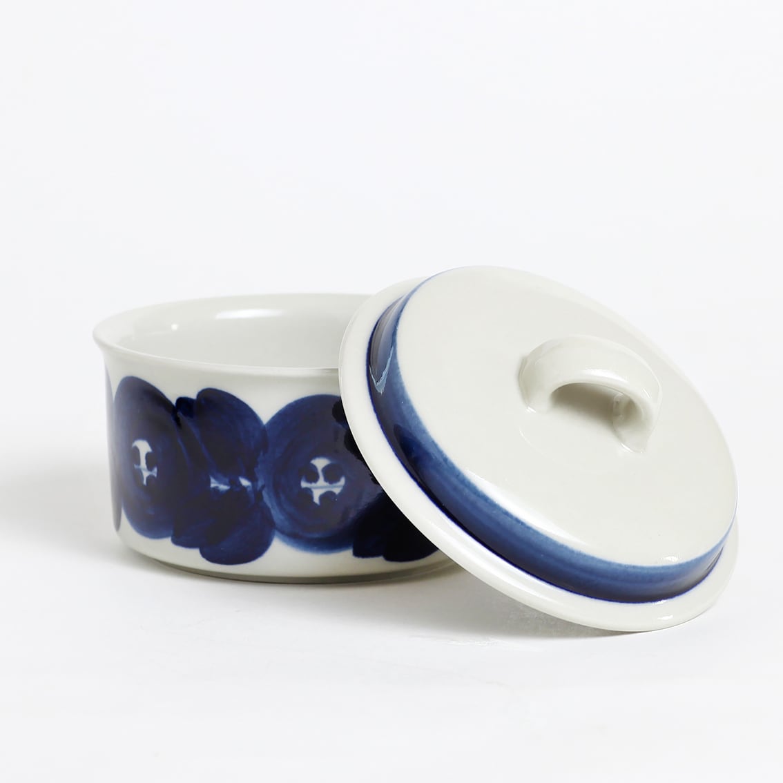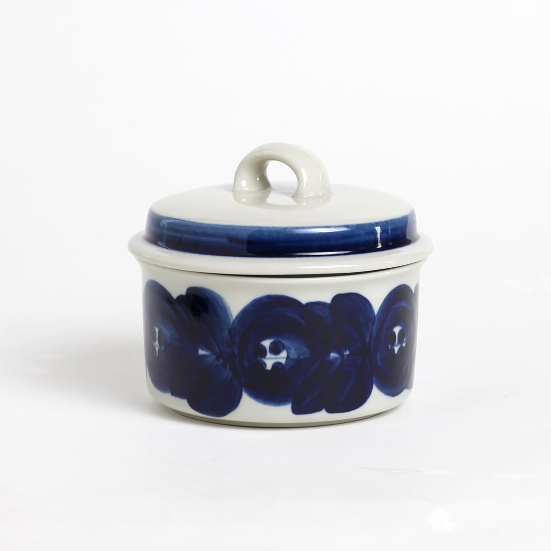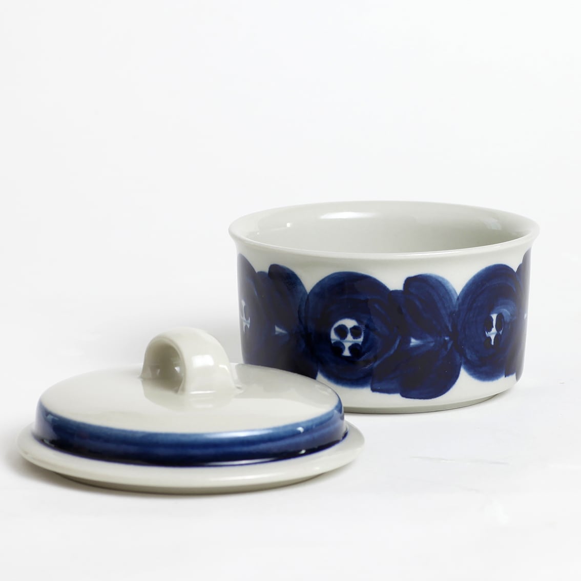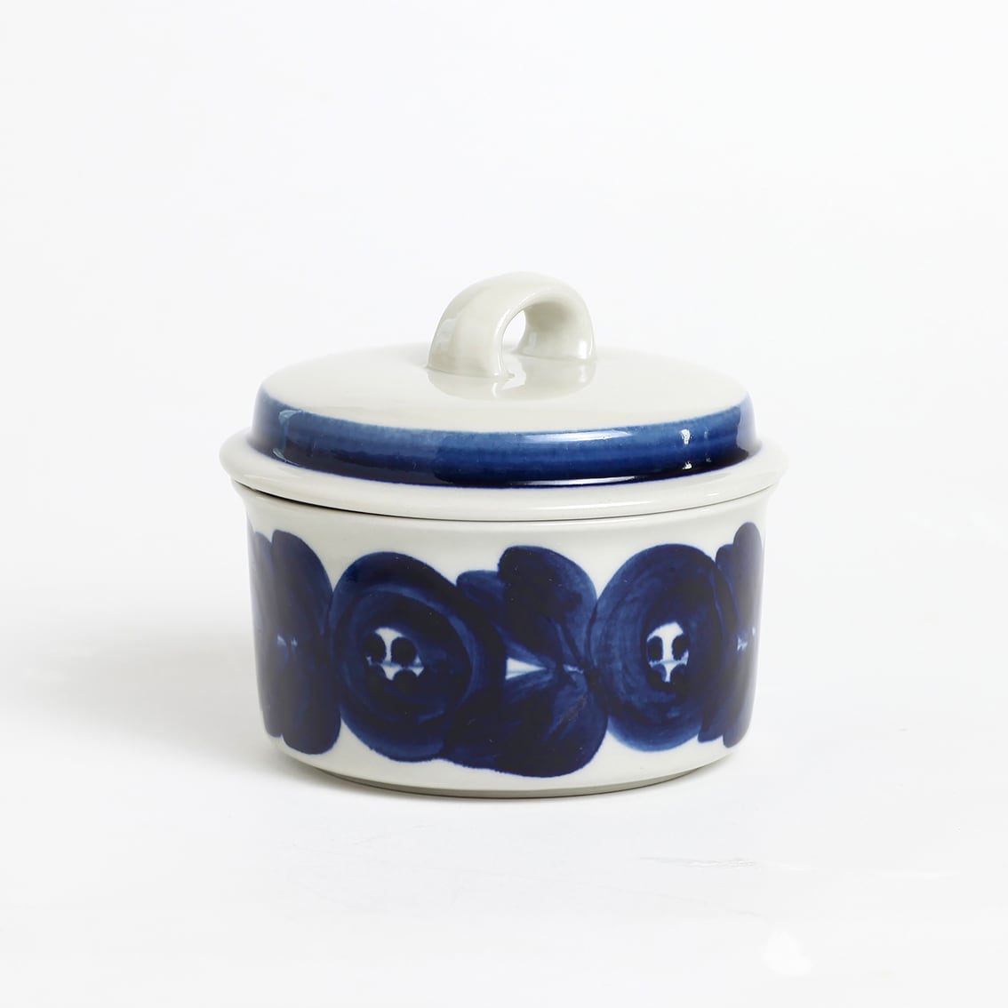 アラビアの代表的なデザイナーUlla Procope(ウラ・プロコペ)がデザインしたAnemone(アネモネ)シリーズの蓋付きシュガーボウルです。ブルーベリーのような深みのある青が大変美しく、一点一点手描きされた丸い花柄は大胆で伸びやか。絵筆の余韻を感じさせるやわらかな絵柄を蓋の太いストライプがきりりと引き締めています。