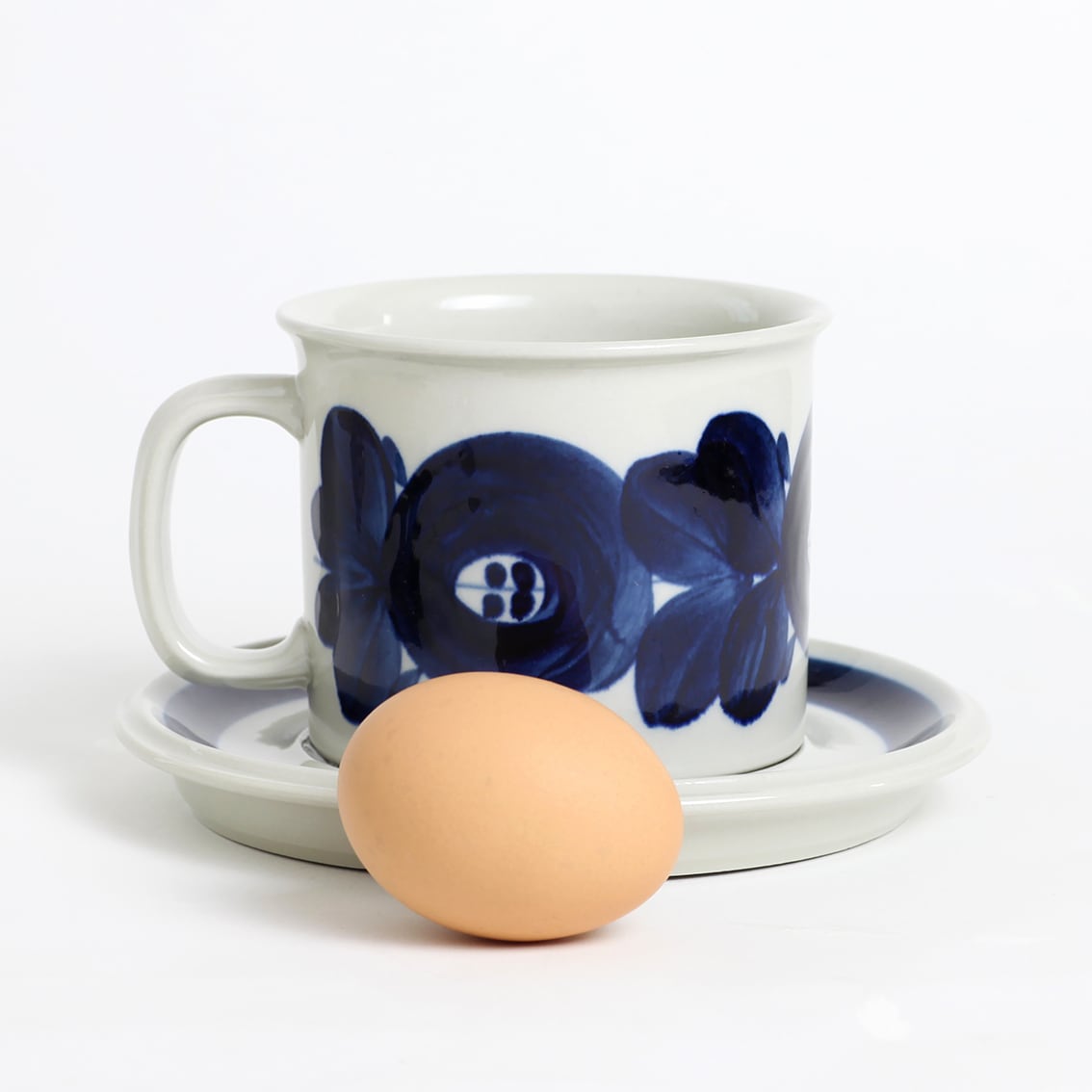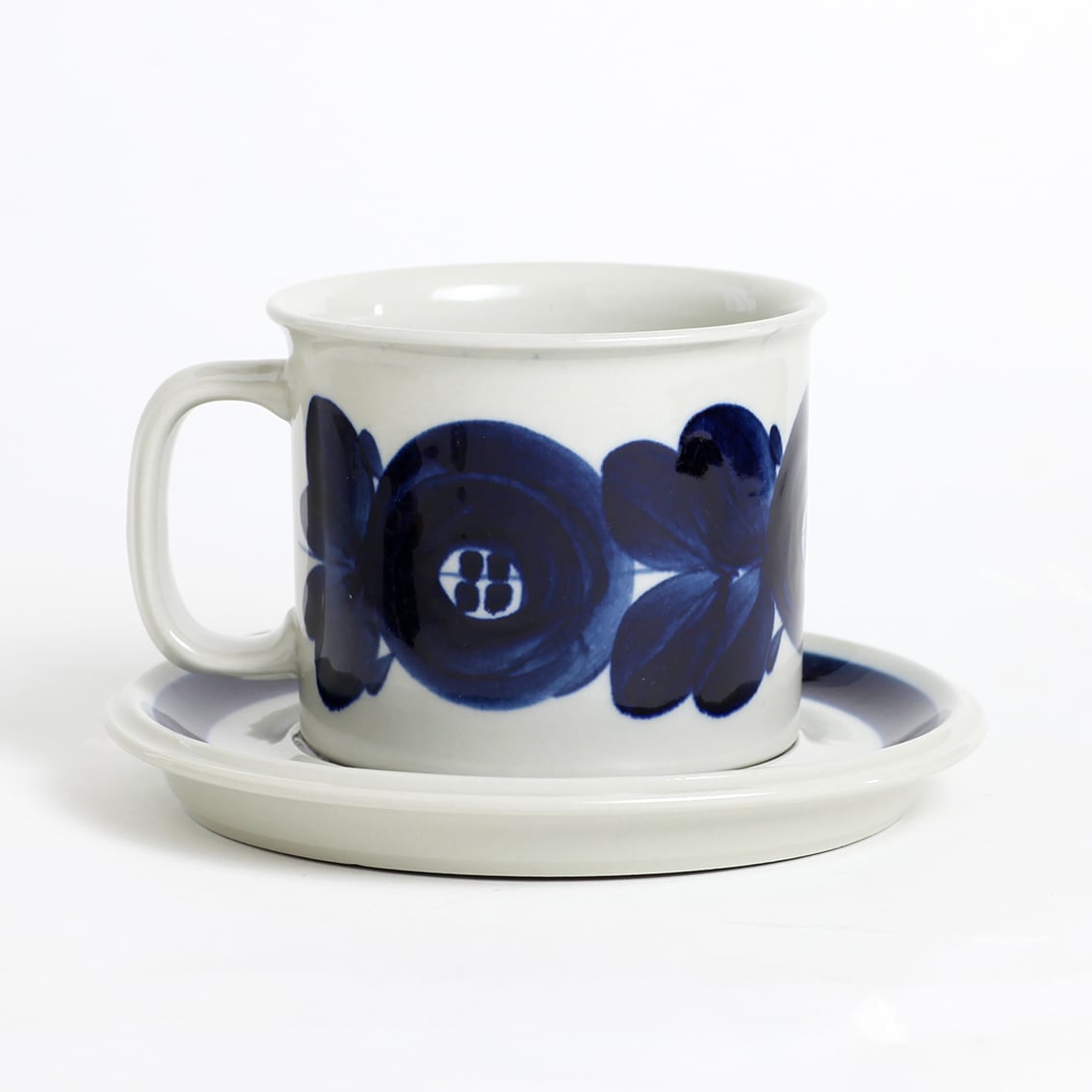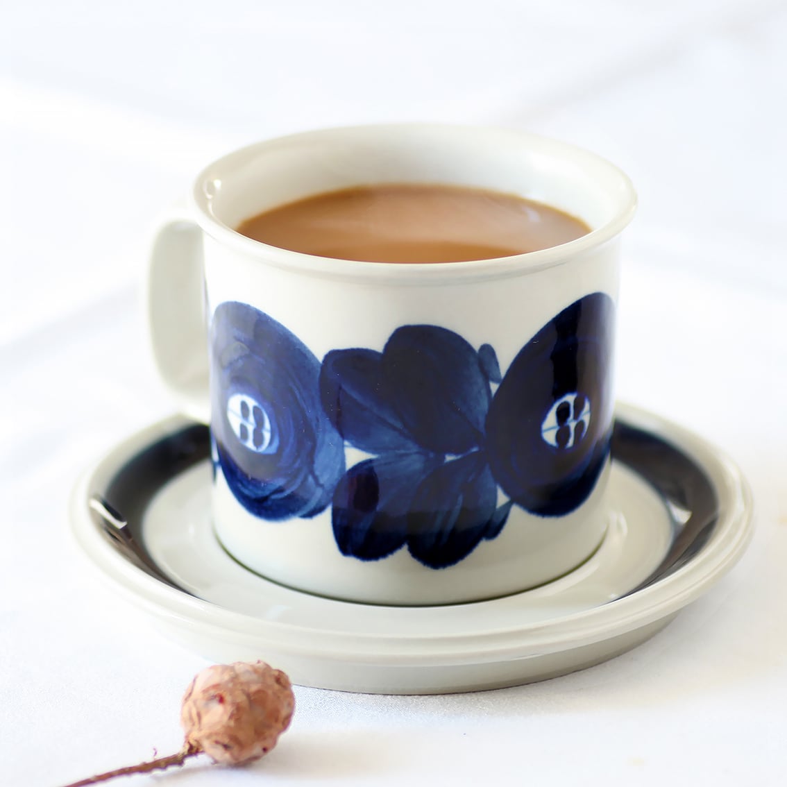 アラビアの代表的なデザイナーUlla Procope(ウラ・プロコペ)がデザインしたAnemone(アネモネ)シリーズのエクストララージマグカップ&ソーサーです。ブルーベリーのような深みのある青が大変美しく、一点一点手描きされた丸い花柄は大胆で伸びやか。絵筆の余韻を感じさせるやわらかな絵柄をソーサーの太いストライプがきりりと引き締めています。こちらは容量約400mlほどの大きなマグカップです。たっぷりのカフェオレを注いでどうぞ。
