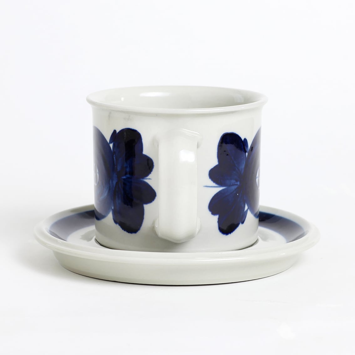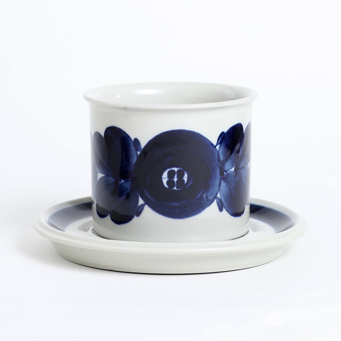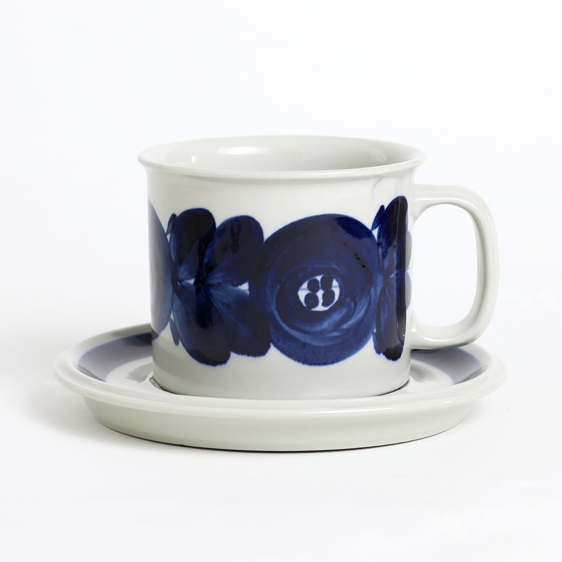 アラビアの代表的なデザイナーUlla Procope(ウラ・プロコペ)がデザインしたAnemone(アネモネ)シリーズのエクストララージマグカップ&ソーサーです。ブルーベリーのような深みのある青が大変美しく、一点一点手描きされた丸い花柄は大胆で伸びやか。絵筆の余韻を感じさせるやわらかな絵柄をソーサーの太いストライプがきりりと引き締めています。こちらは容量約400mlほどの大きなマグカップです。たっぷりのカフェオレを注いでどうぞ。