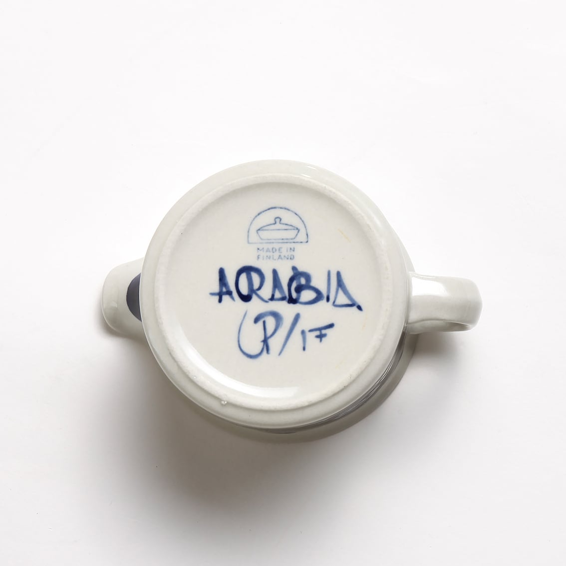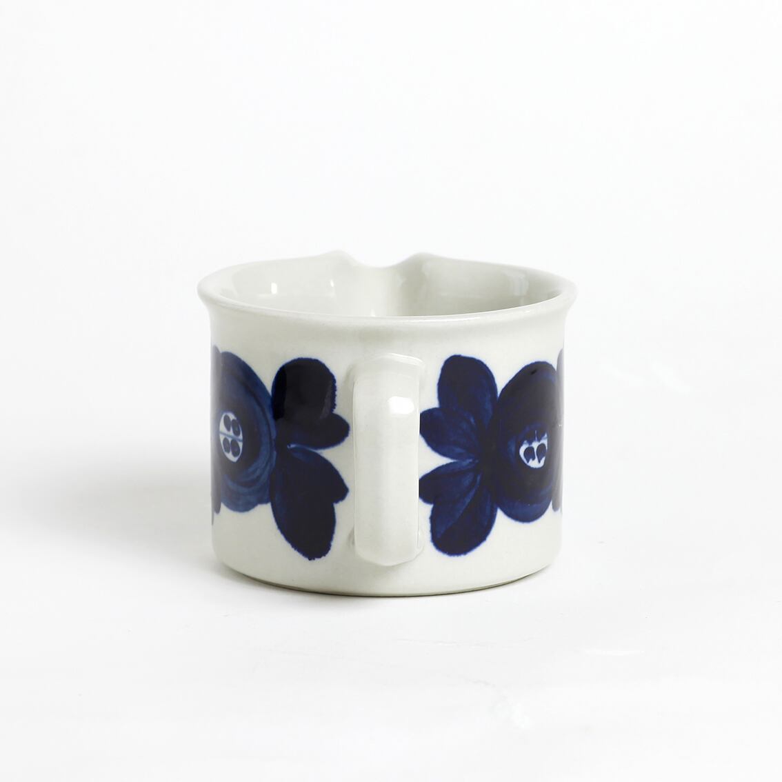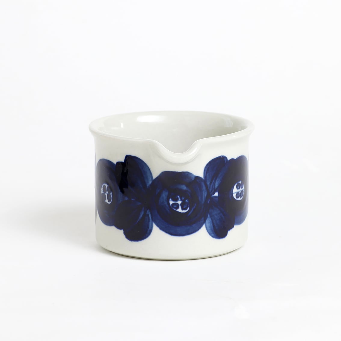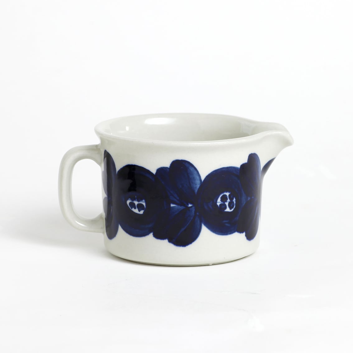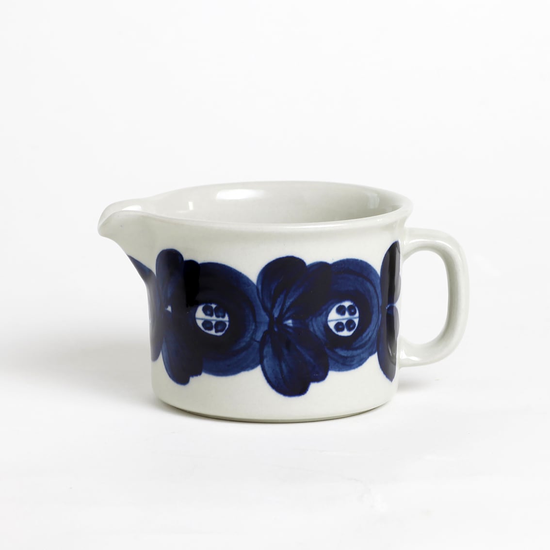 アラビアの代表的なデザイナーUlla Procope(ウラ・プロコペ)がデザインしたAnemone(アネモネ)シリーズのミルクピッチャーです。ブルーベリーのような深みのある青が大変美しく、一点一点手描きされた花柄は大胆で伸びやか。単色であるにもかかわらず、職人の筆運びがその丸い花とふっくらした葉をくっきりと表情豊かに浮かび上がらせています。