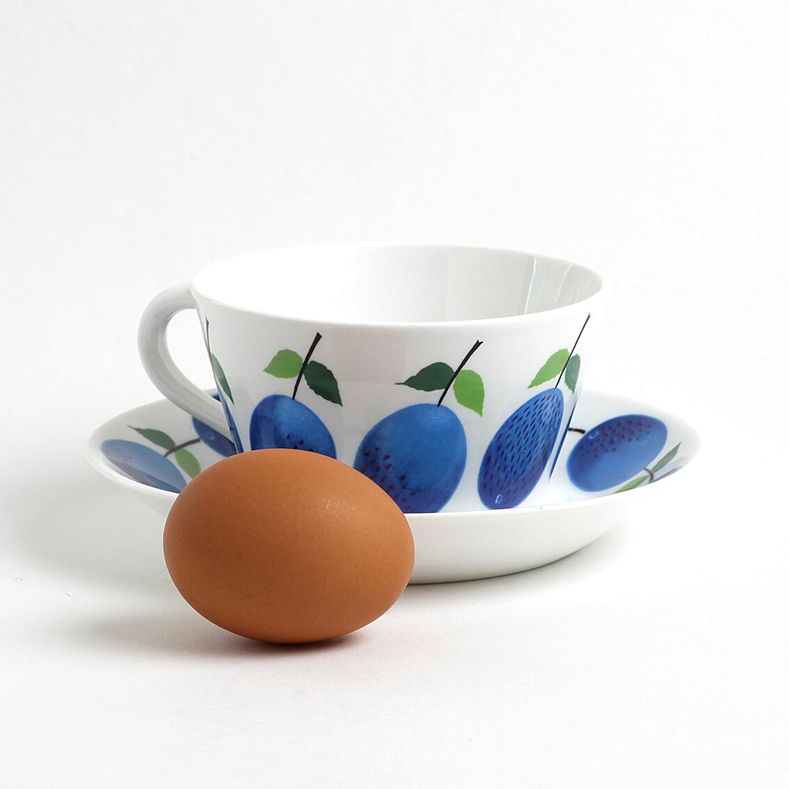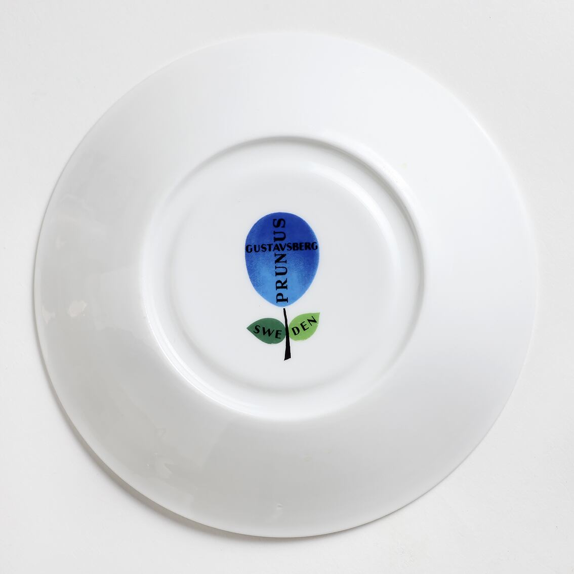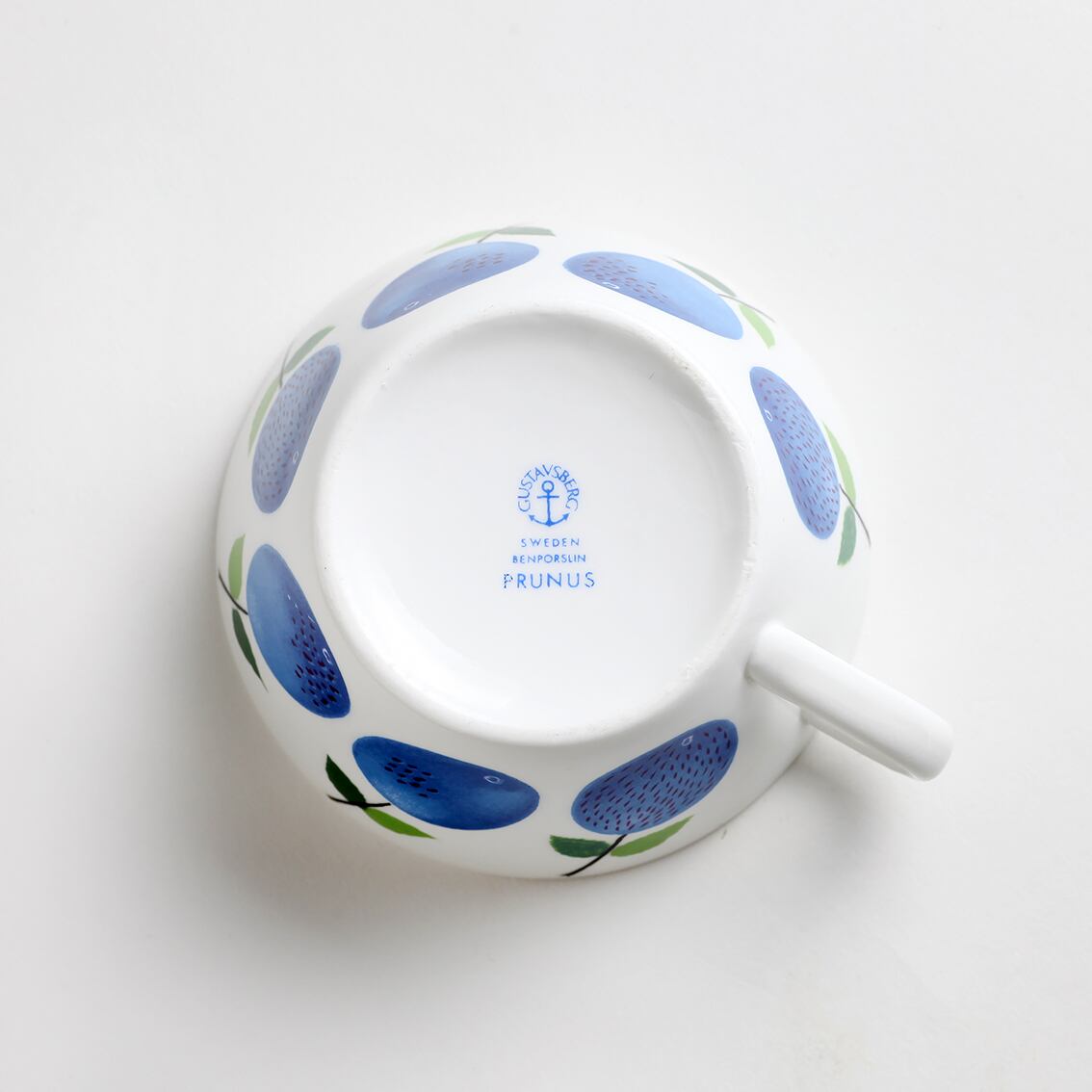 青いスモモが瑞々しいPrunus(プルーヌス)シリーズのティーカップ(∅100mm)&ソーサーです。Stig Lindberg(スティグ・リンドベリ)の数ある傑作の中でも特に有名なシリーズの一つ。大変人気のシリーズで現在復刻版の製造販売がされていますが、こちらは手間を掛けた滑らかなグラデーションと爽やかな青色が特長の貴重なヴィンテージのプルーヌスです。