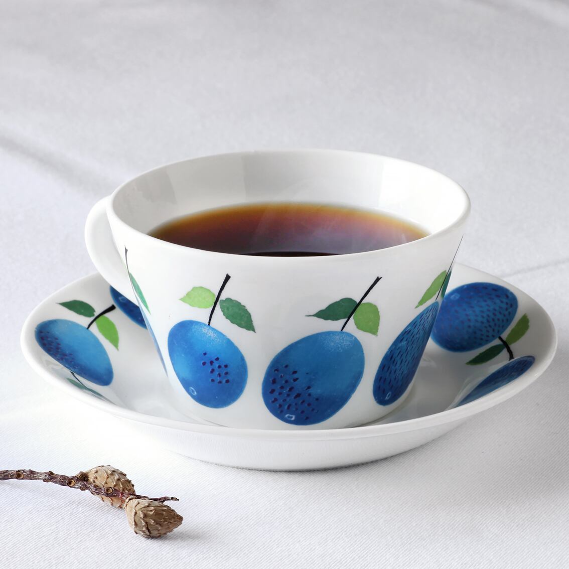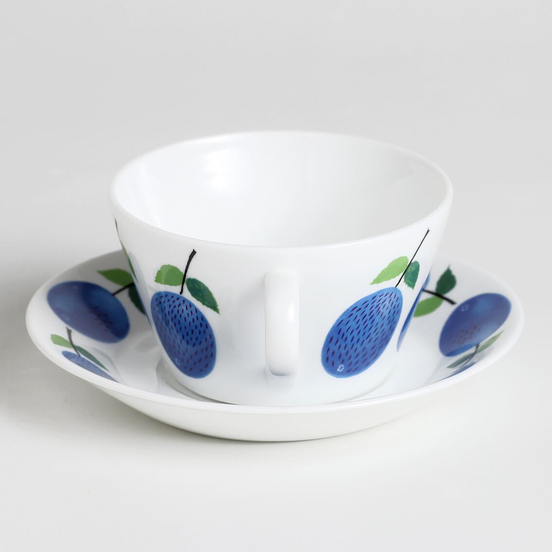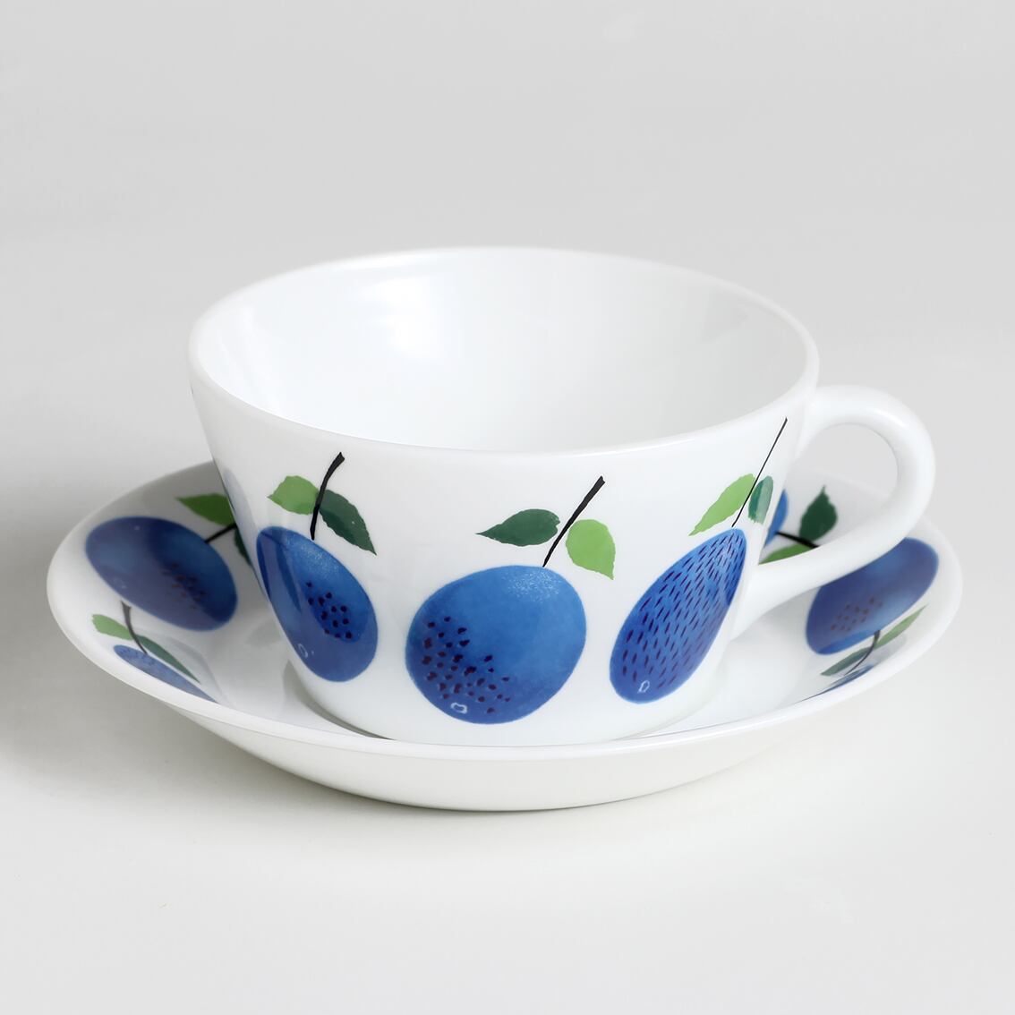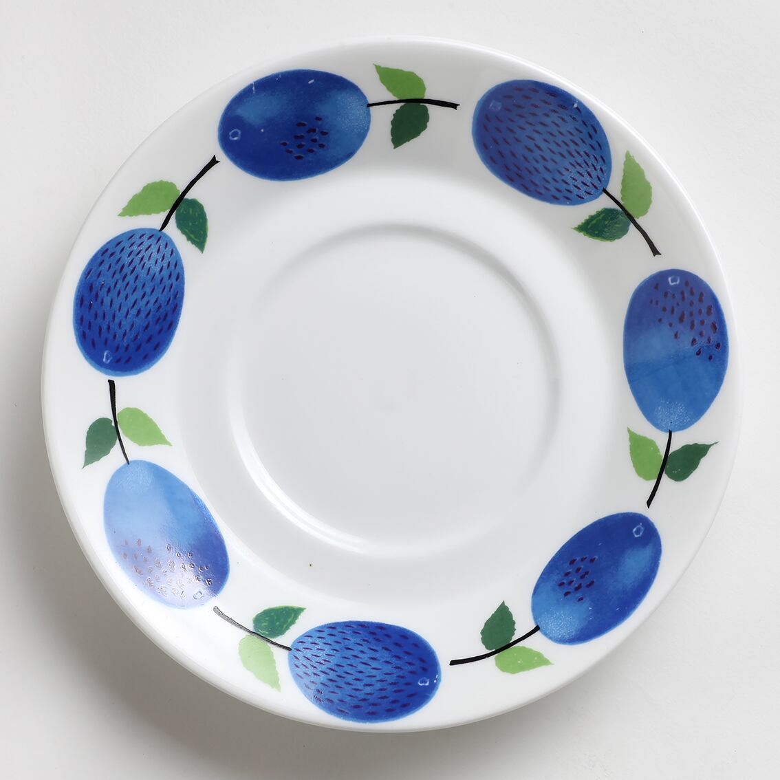 青いスモモが瑞々しいPrunus(プルーヌス)シリーズのティーカップ(∅100mm)&ソーサーです。Stig Lindberg(スティグ・リンドベリ)の数ある傑作の中でも特に有名なシリーズの一つ。大変人気のシリーズで現在復刻版の製造販売がされていますが、こちらは手間を掛けた滑らかなグラデーションと爽やかな青色が特長の貴重なヴィンテージのプルーヌスです。