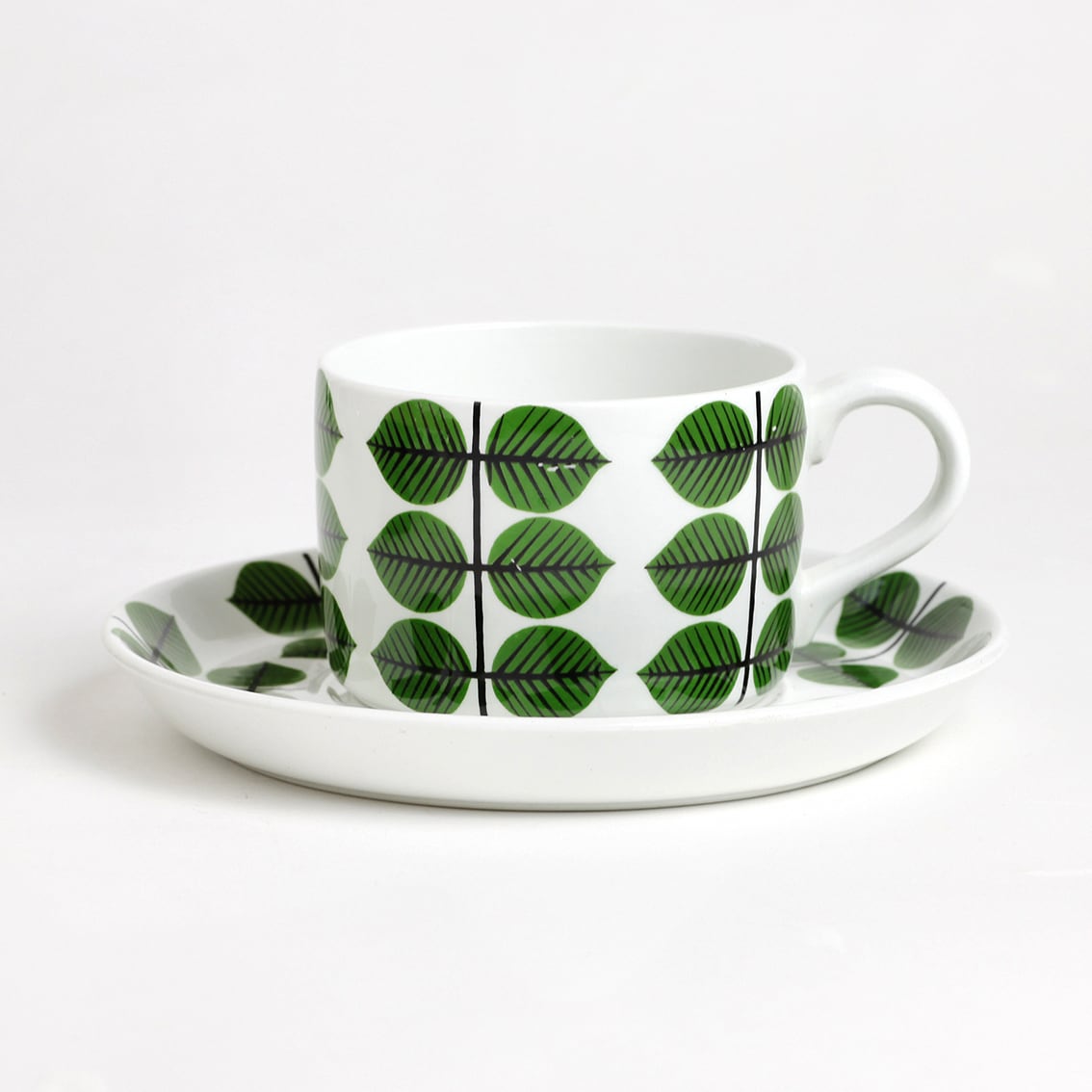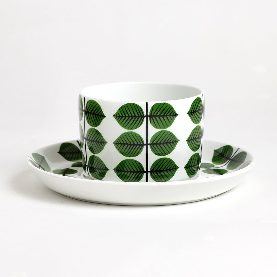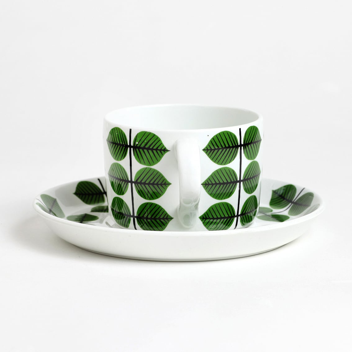Berså(ベルソー/日本ではベルサとも呼ばれます)は庭園などの小さな「あずまや」を意味するスウェーデン語。お茶の時間(FIKA)をイメージして命名されたのでしょうか。巨匠Stig Lindberg(スティグ・リンドベリ)の作品の中でもとくに人気が高いことで知られる Berså は、明快に描かれた緑の葉と白地のコントラストが爽やかな北欧デザインの代名詞ともいえる傑作シリーズです。ヴィンテージベルサのカップ&ソーサーはコーヒーカップ、ティーカップ、モーニングカップ、チョコレートカップの4種類があります。現在復刻版が製造販売されていますがこちらはヴィンテージのティーカップ&ソーサーです。