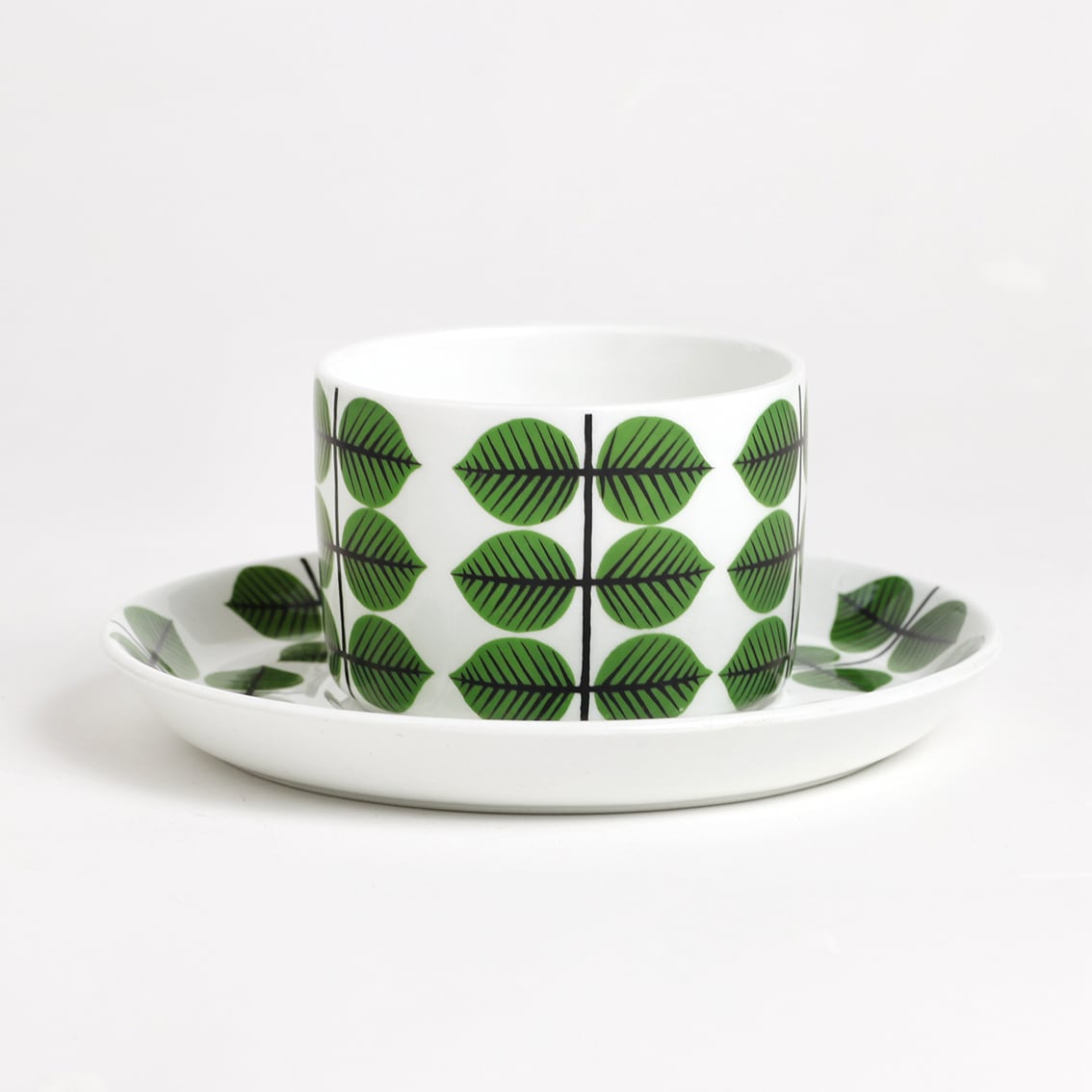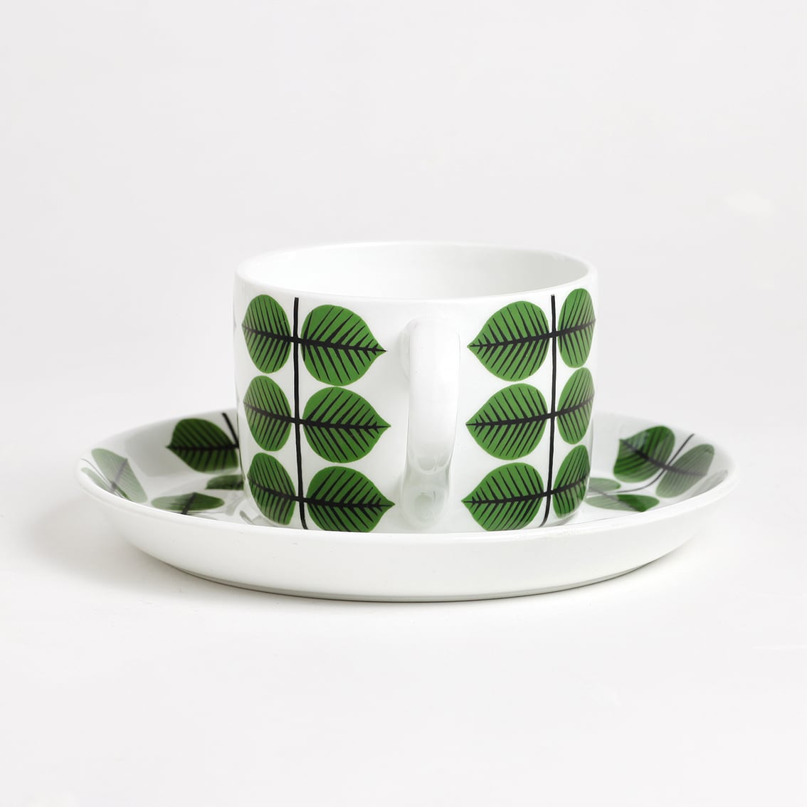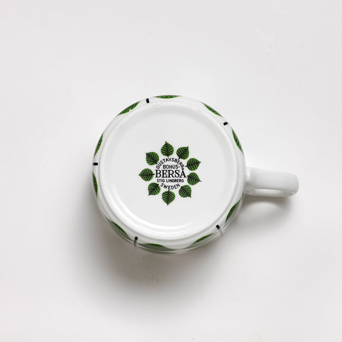 Berså(ベルソー/日本ではベルサとも呼ばれます)は庭園などの小さな「あずまや」を意味するスウェーデン語。お茶の時間(FIKA)をイメージして命名されたのでしょうか。巨匠Stig Lindberg(スティグ・リンドベリ)の作品の中でもとくに人気が高いことで知られる Berså は、明快に描かれた緑の葉と白地のコントラストが爽やかな北欧デザインの代名詞ともいえる傑作シリーズです。ヴィンテージベルサのカップ&ソーサーはコーヒーカップ、ティーカップ、モーニングカップ、チョコレートカップの4種類があります。現在復刻版が製造販売されていますがこちらはヴィンテージのティーカップ&ソーサーです。