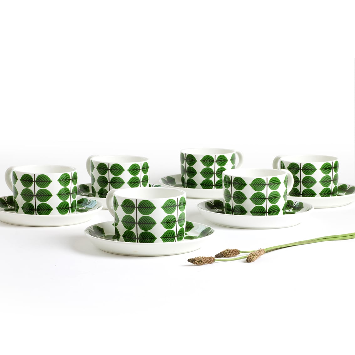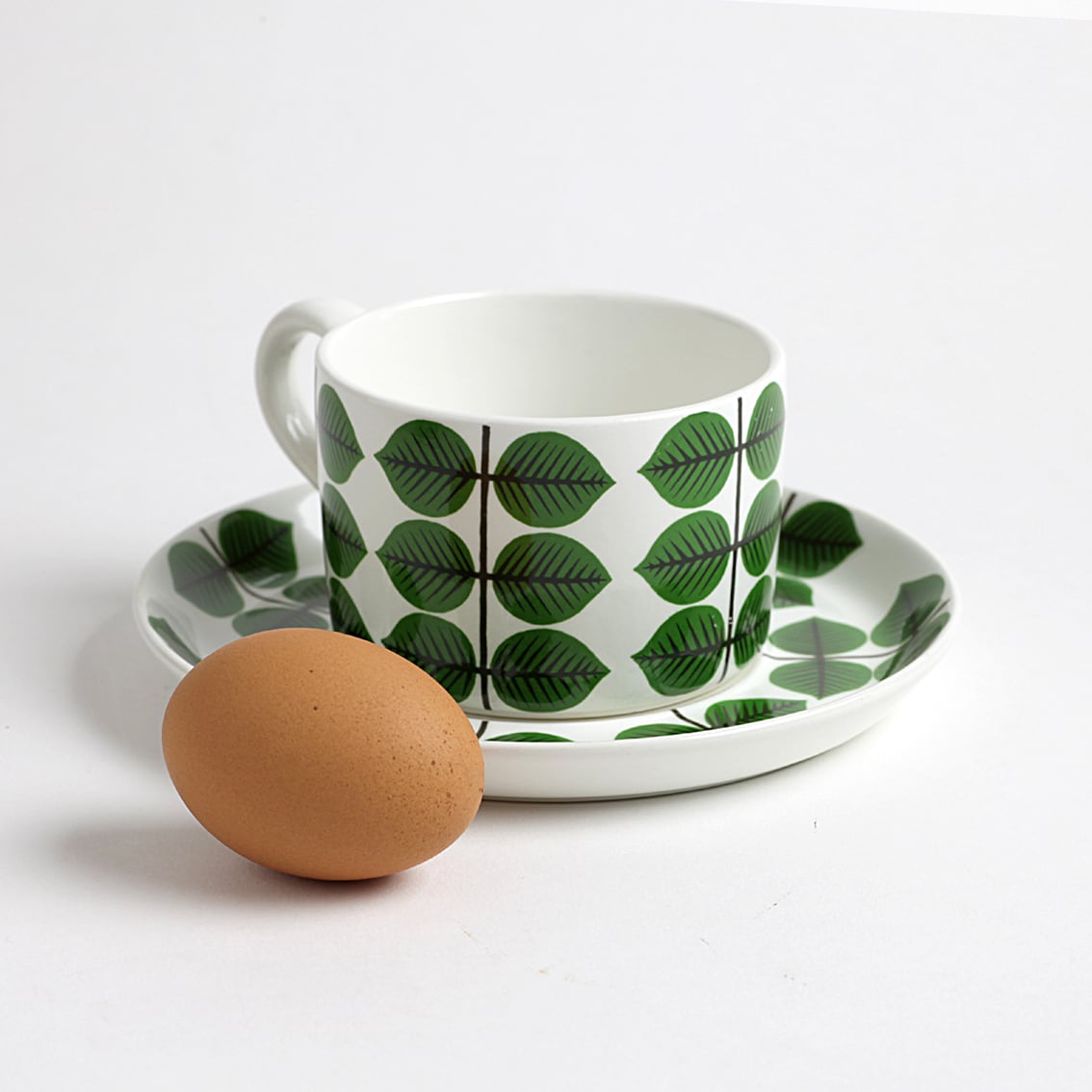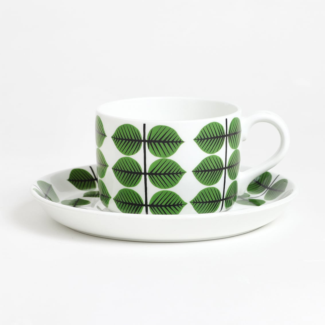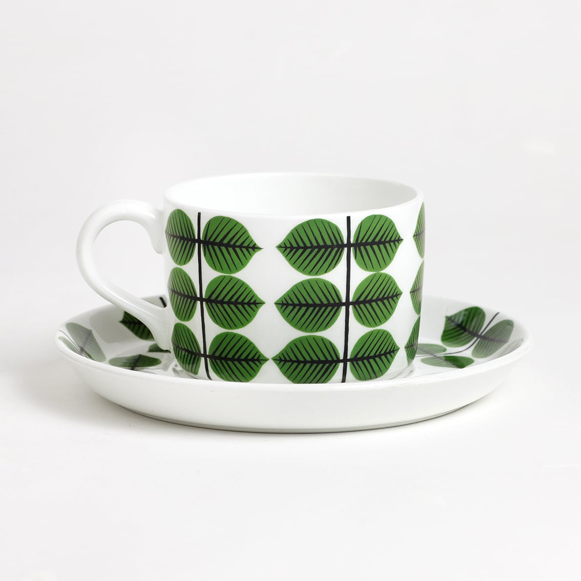 Berså(ベルソー/日本ではベルサとも呼ばれます)は庭園などの小さな「あずまや」を意味するスウェーデン語。お茶の時間(FIKA)をイメージして命名されたのでしょうか。巨匠Stig Lindberg(スティグ・リンドベリ)の作品の中でもとくに人気が高いことで知られる Berså は、明快に描かれた緑の葉と白地のコントラストが爽やかな北欧デザインの代名詞ともいえる傑作シリーズです。ヴィンテージベルサのカップ&ソーサーはコーヒーカップ、ティーカップ、モーニングカップ、チョコレートカップの4種類があります。現在復刻版が製造販売されていますがこちらはヴィンテージのティーカップ&ソーサーです。