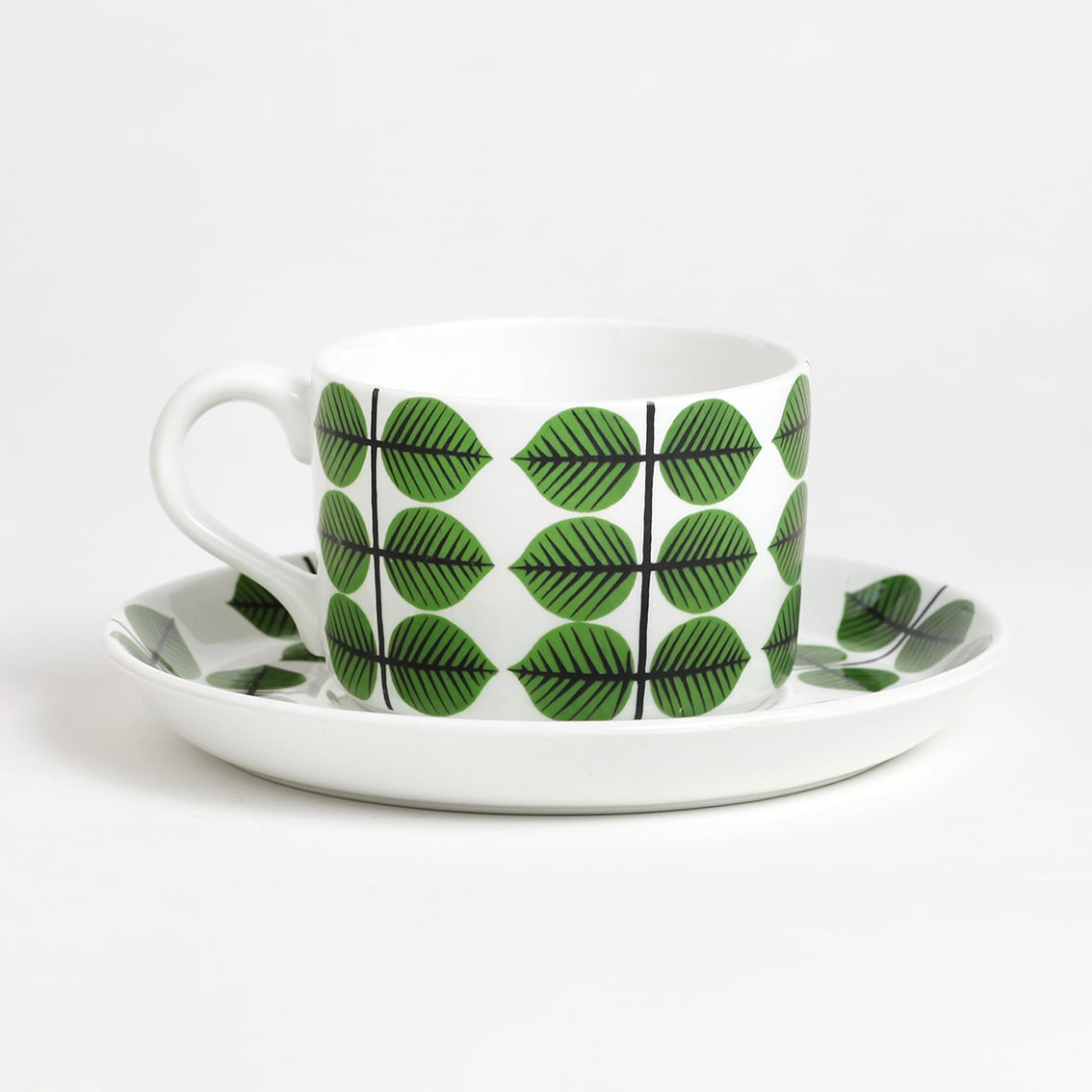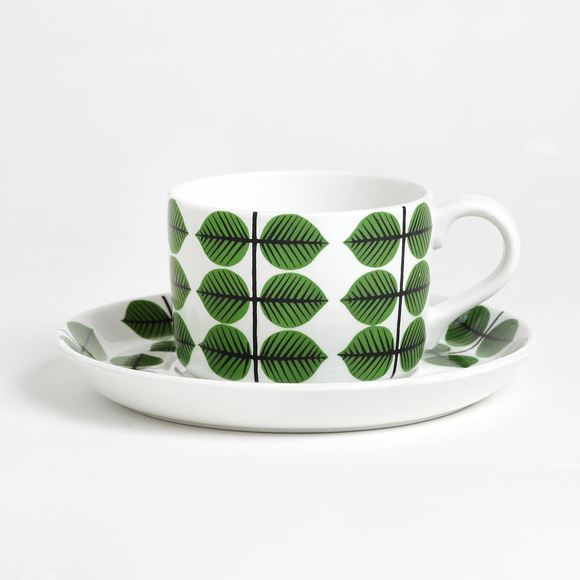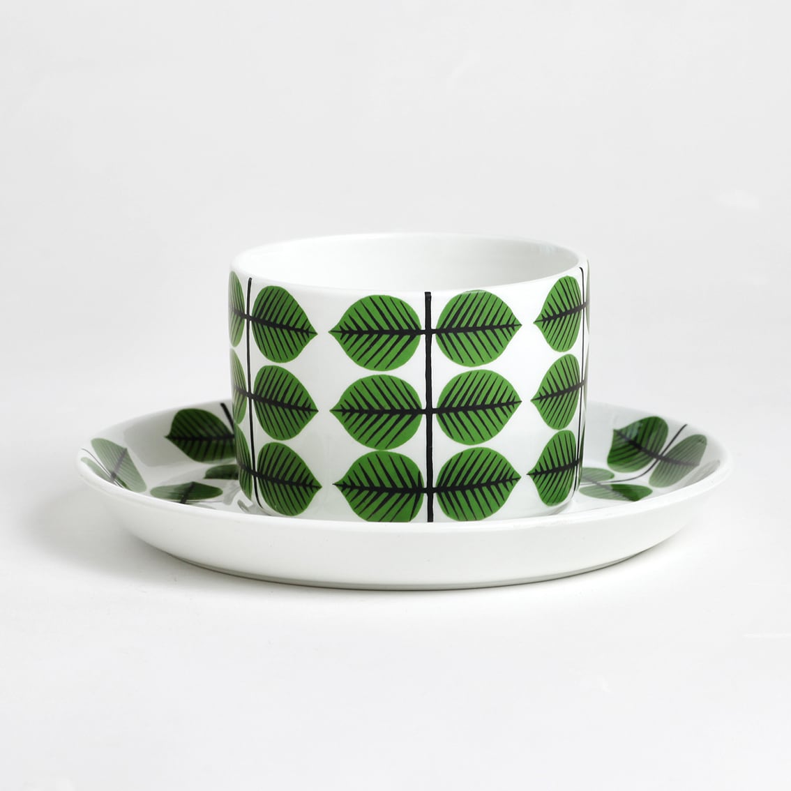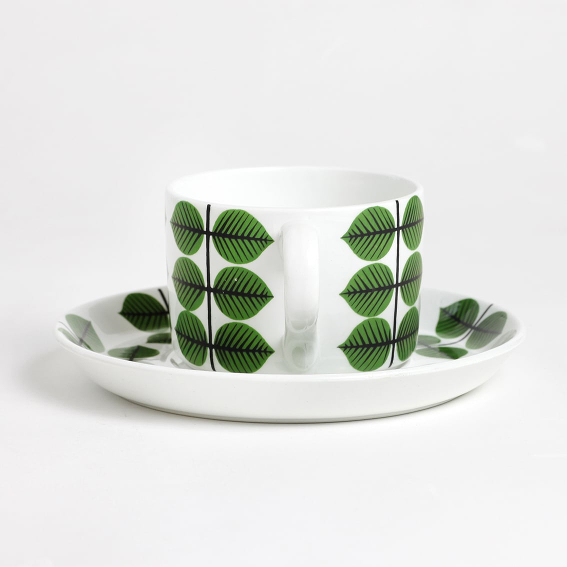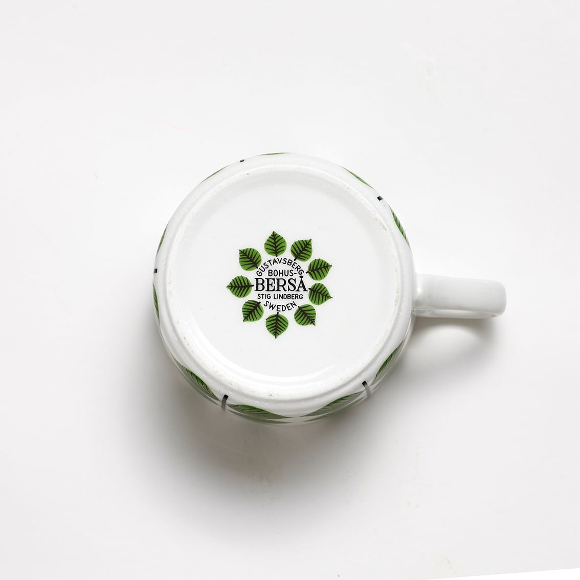 Berså(ベルソー/日本ではベルサとも呼ばれます)は庭園などの小さな「あずまや」を意味するスウェーデン語。お茶の時間(FIKA)をイメージして命名されたのでしょうか。巨匠Stig Lindberg(スティグ・リンドベリ)の作品の中でもとくに人気が高いことで知られる Berså は、明快に描かれた緑の葉と白地のコントラストが爽やかな北欧デザインの代名詞ともいえる傑作シリーズです。ヴィンテージベルサのカップ&ソーサーはコーヒーカップ、ティーカップ、モーニングカップ、チョコレートカップの4種類があります。現在復刻版が製造販売されていますがこちらはヴィンテージのティーカップ&ソーサーです。