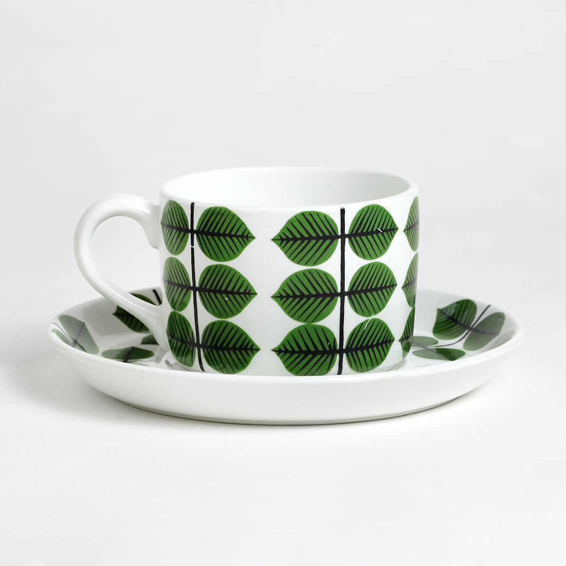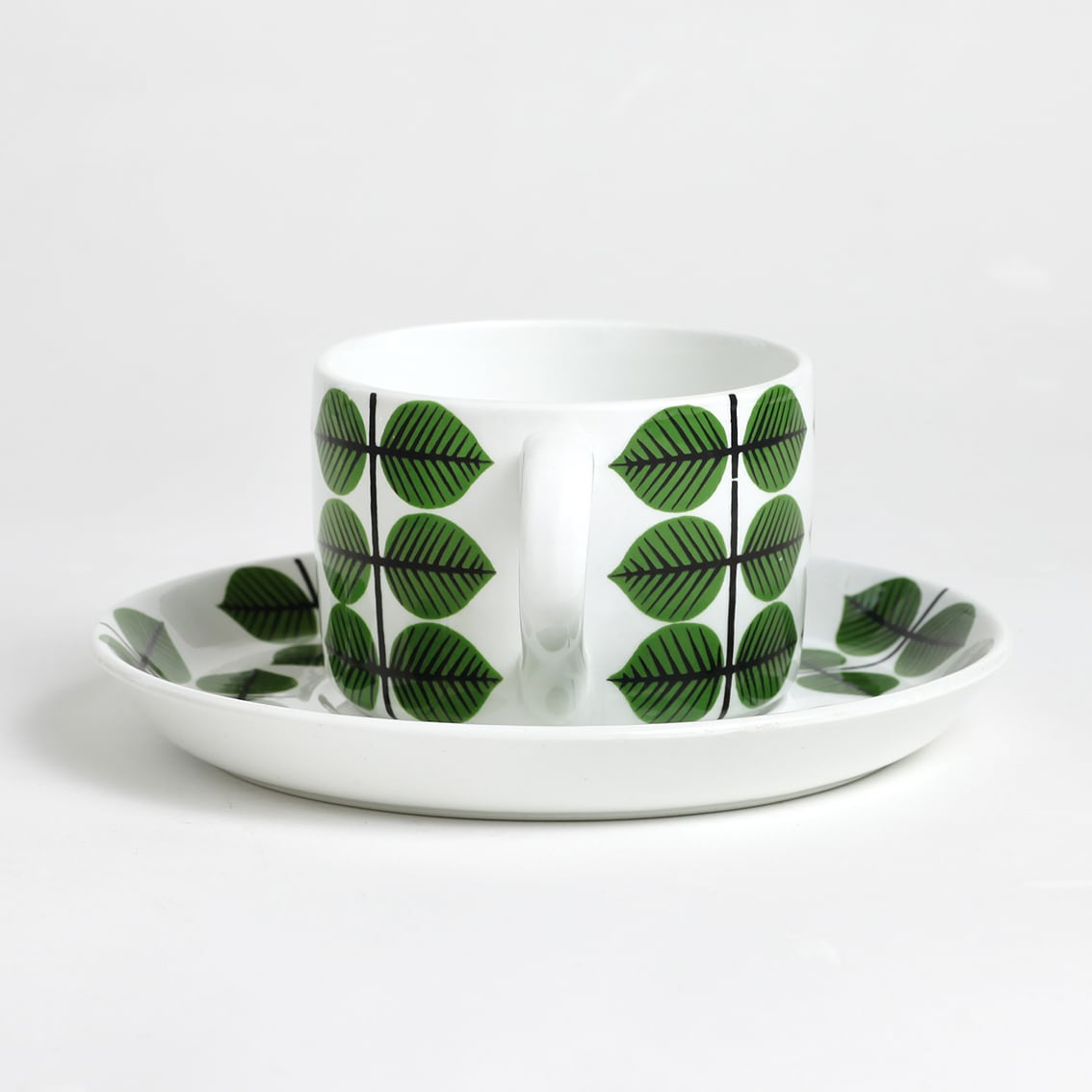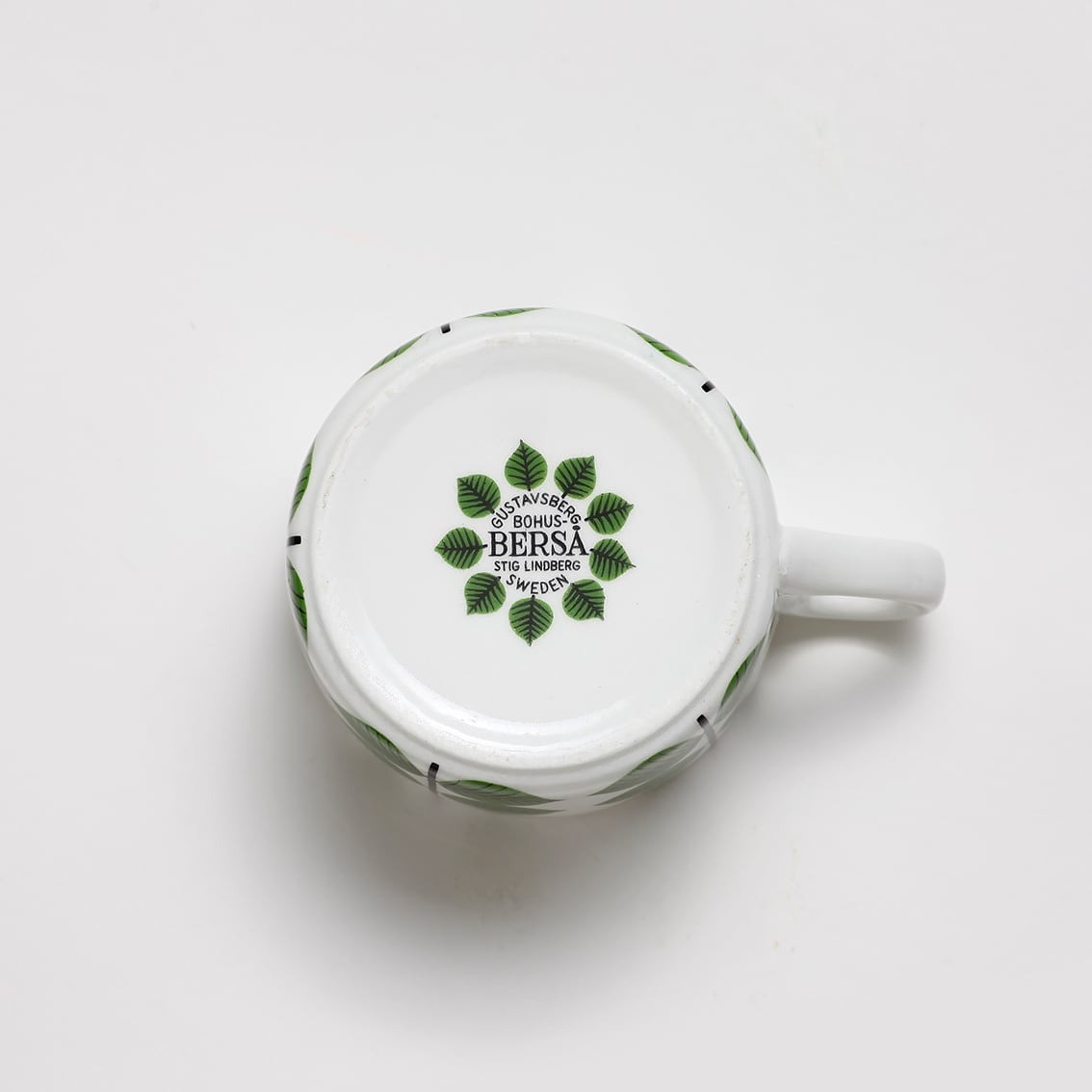 Berså(ベルソー/日本ではベルサとも呼ばれます)は庭園などの小さな「あずまや」を意味するスウェーデン語。お茶の時間(FIKA)をイメージして命名されたのでしょうか。巨匠Stig Lindberg(スティグ・リンドベリ)の作品の中でもとくに人気が高いことで知られる Berså は、明快に描かれた緑の葉と白地のコントラストが爽やかな北欧デザインの代名詞ともいえる傑作シリーズです。ヴィンテージベルサのカップ&ソーサーはコーヒーカップ、ティーカップ、モーニングカップ、チョコレートカップの4種類があります。現在復刻版が製造販売されていますがこちらはヴィンテージのティーカップ&ソーサーです。