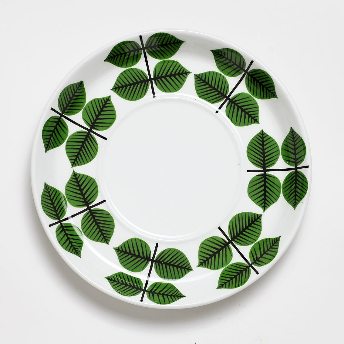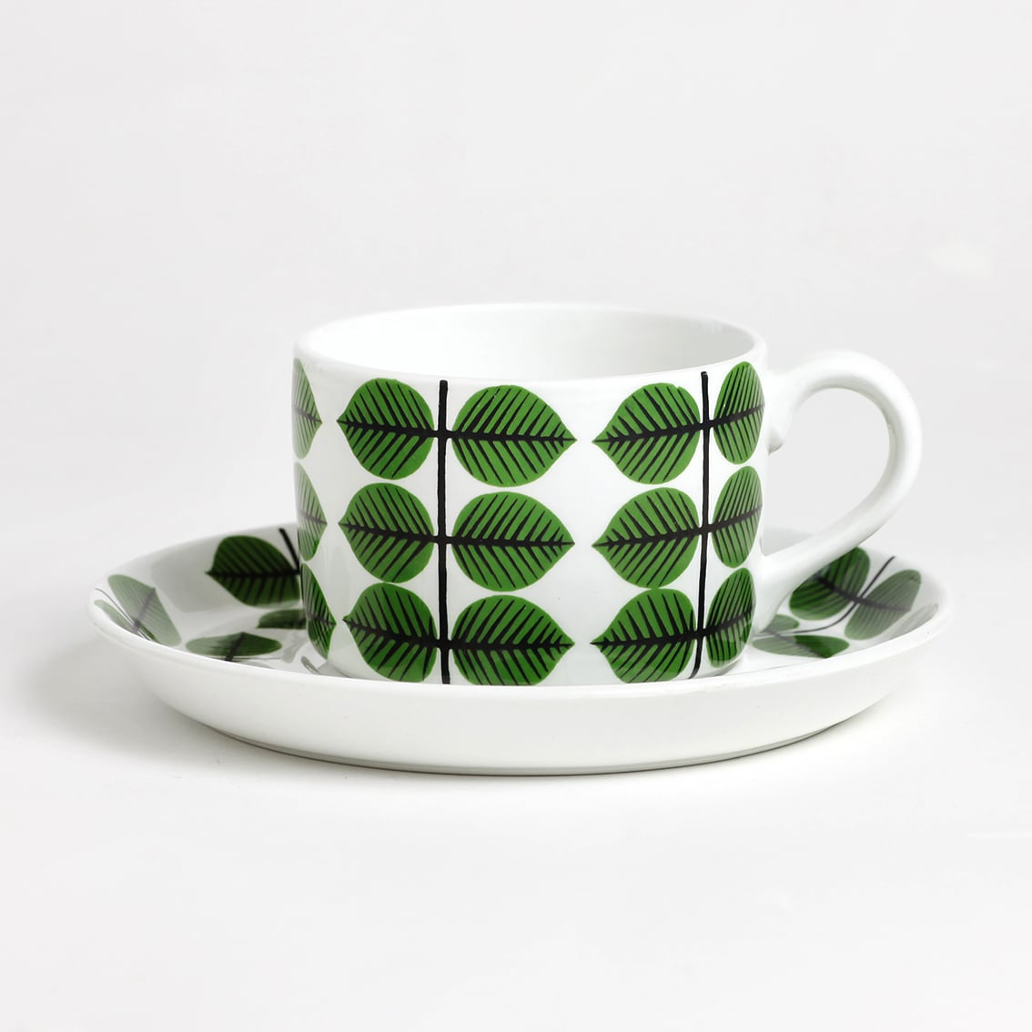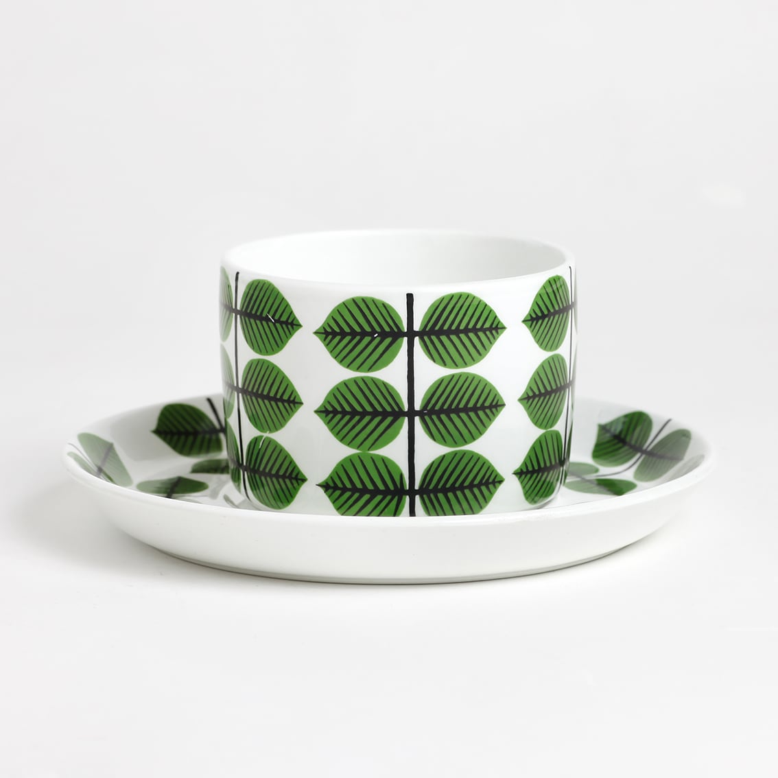Berså(ベルソー/日本ではベルサとも呼ばれます)は庭園などの小さな「あずまや」を意味するスウェーデン語。お茶の時間(FIKA)をイメージして命名されたのでしょうか。巨匠Stig Lindberg(スティグ・リンドベリ)の作品の中でもとくに人気が高いことで知られる Berså は、明快に描かれた緑の葉と白地のコントラストが爽やかな北欧デザインの代名詞ともいえる傑作シリーズです。ヴィンテージベルサのカップ&ソーサーはコーヒーカップ、ティーカップ、モーニングカップ、チョコレートカップの4種類があります。現在復刻版が製造販売されていますがこちらはヴィンテージのティーカップ&ソーサーです。