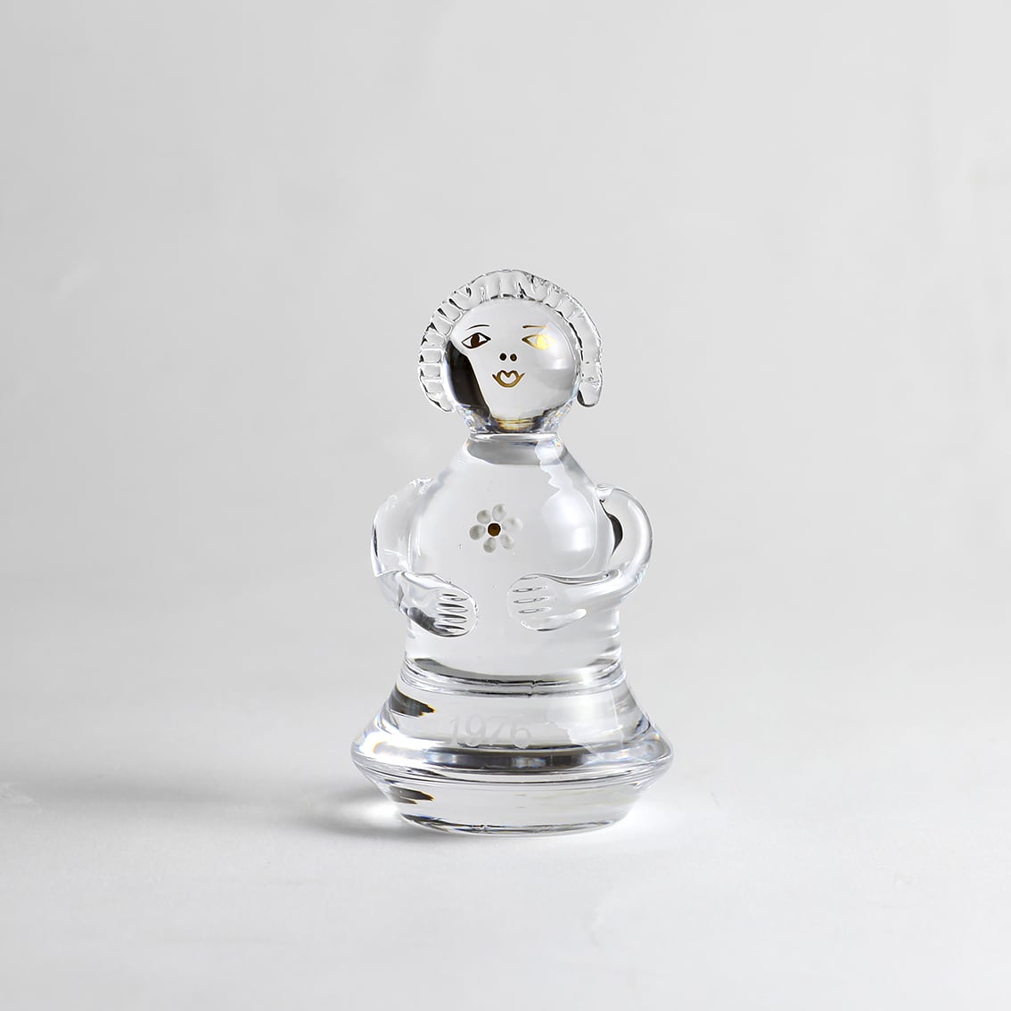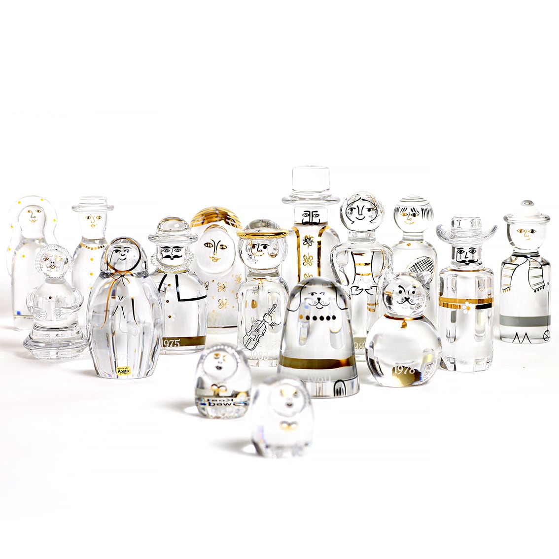 FamilijenはスウェーデンのKosta Boda社が1970年から1984年にかけて発表したクリスタルガラスのコレクターシリーズで、毎年1~2体ずつ新しい家族が加わりました。お母さん、双子の赤ちゃん、叔母さん、おじいさん、猫、犬など合計16体のガラスの大家族。制作者はGöran Wärff(ヨーラン・ヴァルフ)Ann Wärff(アン・ヴァルフ)夫妻。ヨーランがデザインしたかわいいフォルムのガラスに、軽やかな筆使いでアンが個性豊かなキャラクターたちを金・黒・白で描いています。