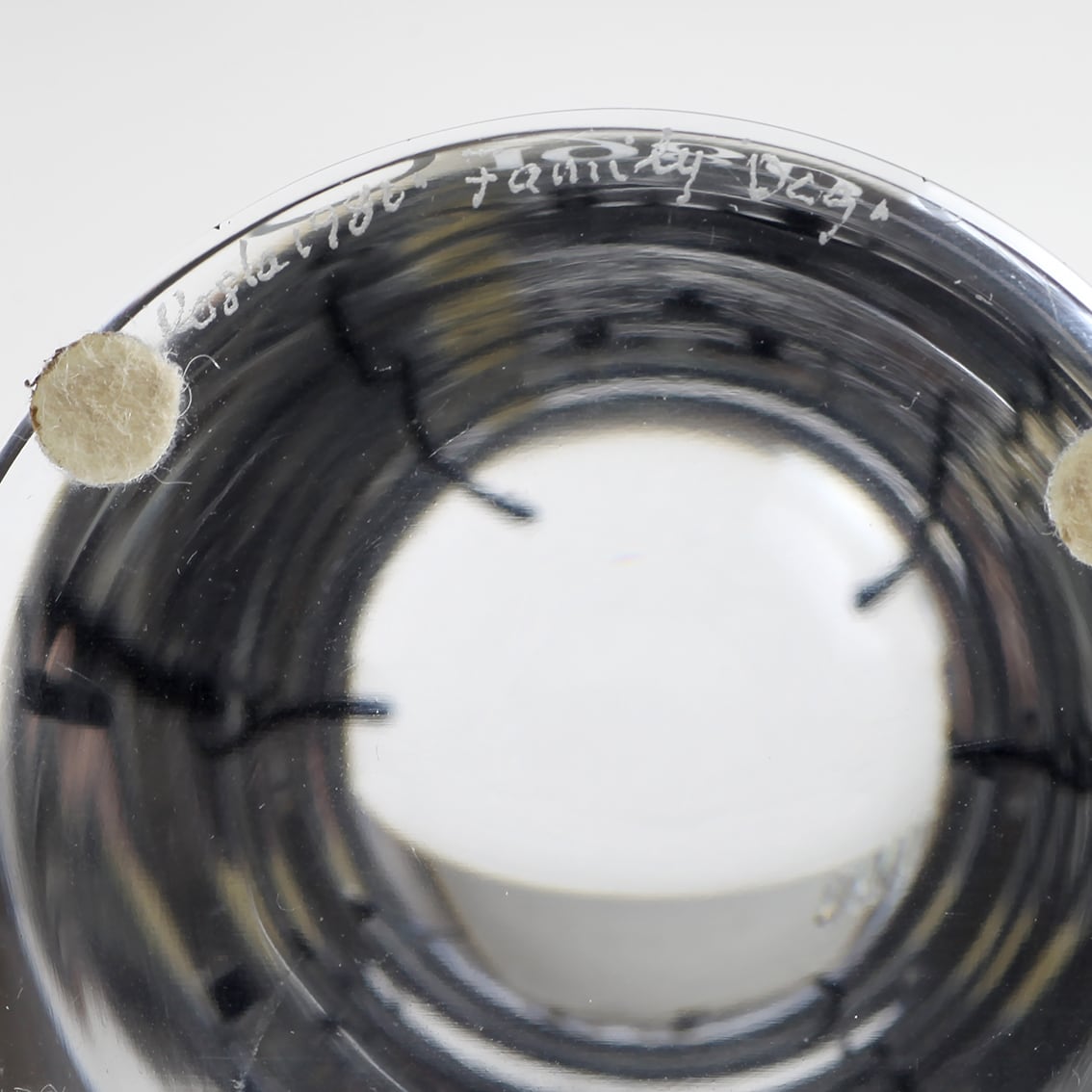 にぎやかにファミリーを揃えてみたり、重量感と安定感のあるクリスタルガラスなのでペーパーウェイトとしても。底面に制作年と作品名が刻まれています。