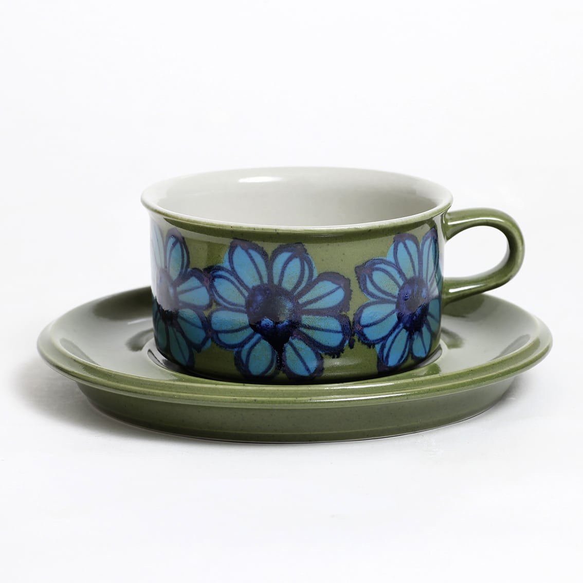 アラビア社(ARABIA)アート部門の Hilkka-Lisa Ahola(ヒルッカ・リーサ・アホラ)が1960年代にデザインしたティーカップ&ソーサーです。1点1点職人が手描きしているため同じものがありません。オリーブグリーンの地に紺色と水色の大胆な色づかいで大きな花が伸び伸びと描かれています。同社のアート部門を代表するデザイナー、ヒルッカ・リーサ・アホラならではの自由な色彩感覚が美しく花ひらいた逸品です。