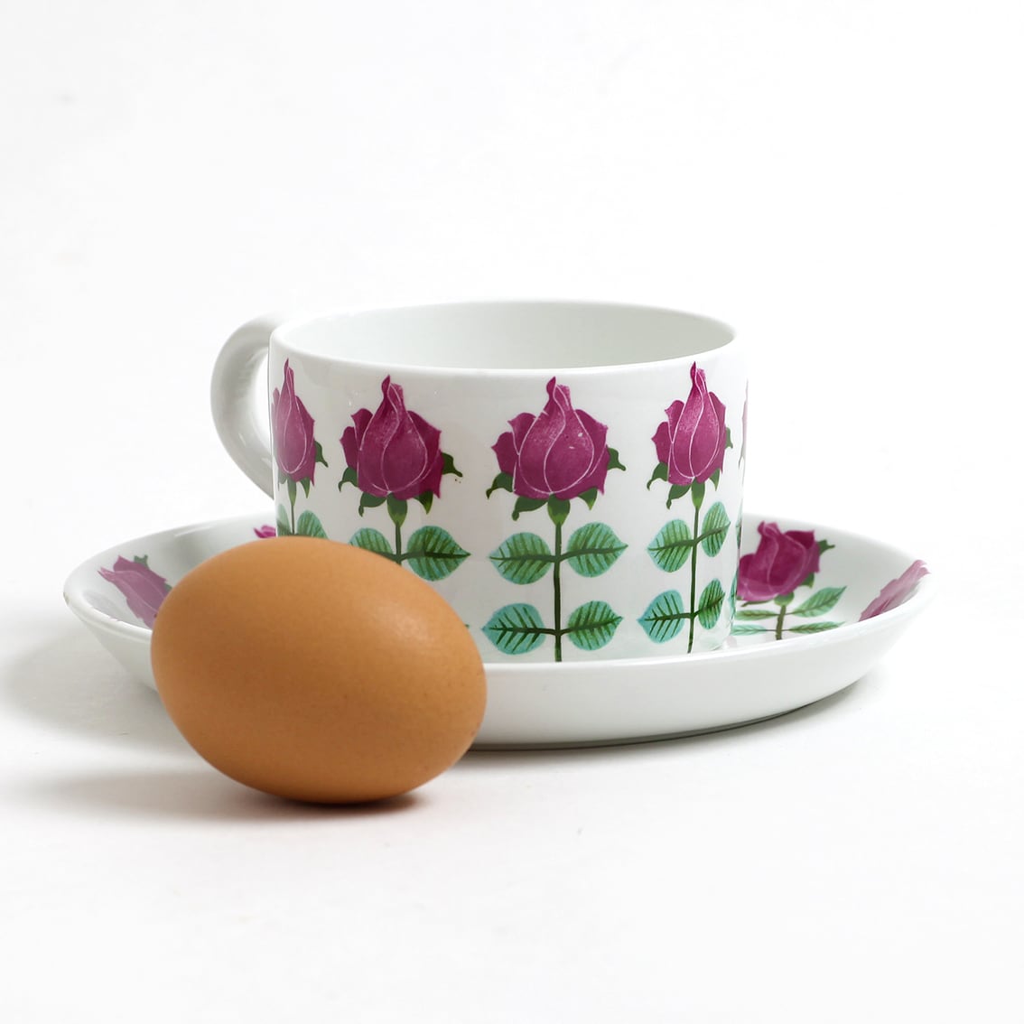 1962年から65年までの3年間のみ作られた非常に流通数の少ない貴重なシリーズPynta (ピンタ)のカップ&ソーサーです。Stig Lindberg(スティッグ・リンドベリ)による洒落た絵柄が特徴でアイテムごとに絵柄が全く違う特徴があります。カップ&ソーサーはリンドベリの普段使いのシリーズの中では最も希少価値の高いシリーズの一つで、コンディションの良い品を見つけることは大変難しくコレクターズアイテムとなっております。今にも開花しそうな薔薇を、庭から剪ってきたばかりのようなみずみずしい絵柄です。