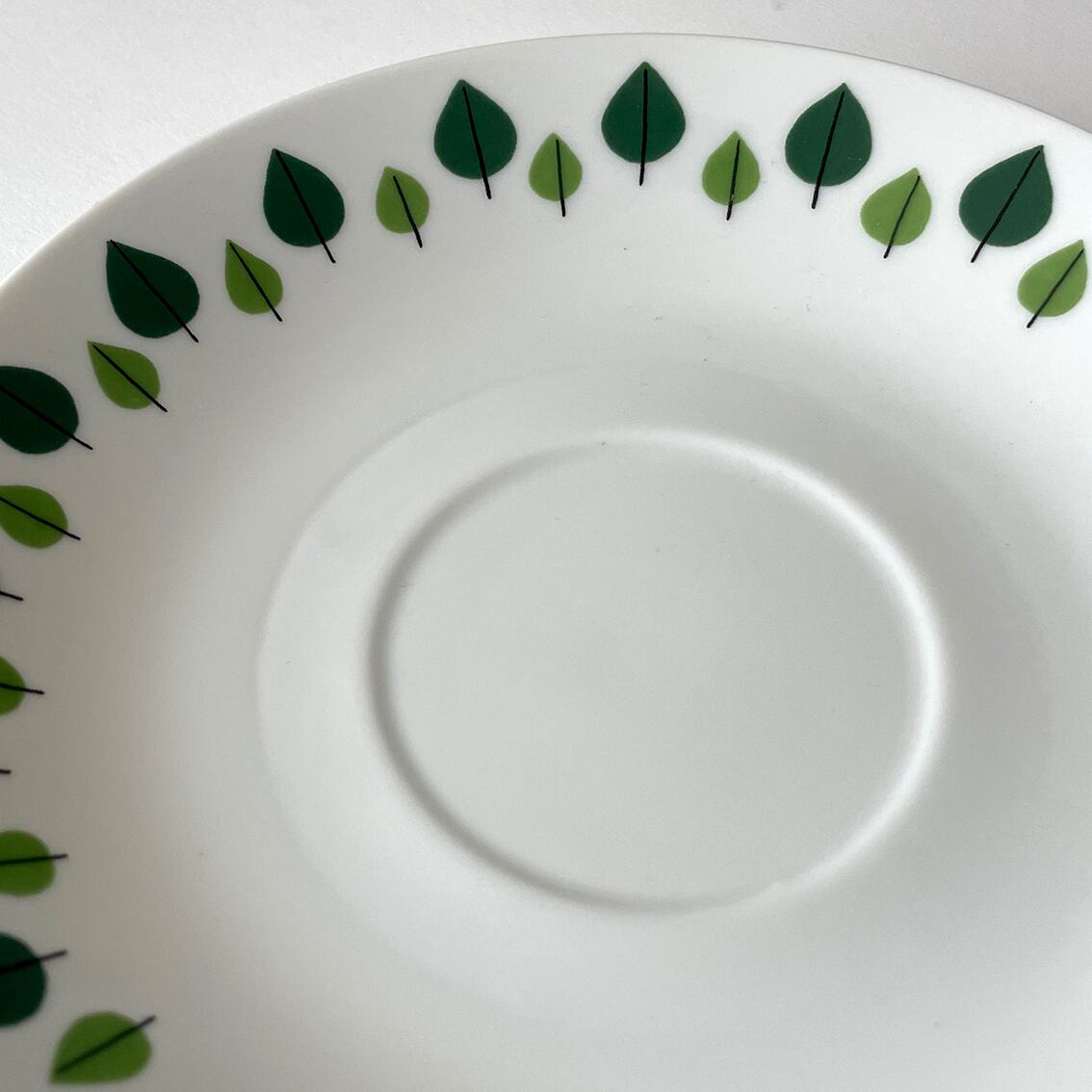 清潔感あふれる白地に濃淡2色のグリーンで描かれた可愛いかたちは公園の木々でしょうか。並べた葉っぱのようにも見えますね。ふっくら丸い浅めのカップに、なだらかなカーブが美しいケーキプレート。フォルムの優しさも魅力です。