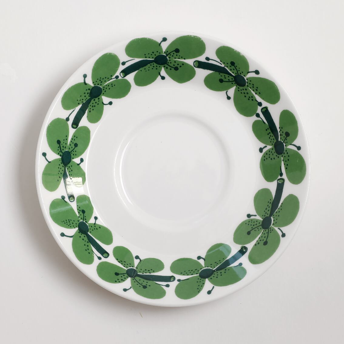 イタリア語で緑を意味するVerdiはStig Lindberg(スティグ・リンドベリ)の後期を代表する幻の作品のひとつです。切り花を並べたイメージでしょうか。ポップな花柄がカップにもソーサーにもリズミカルに描かれ、蝶が輪舞しているような躍動感が感じられます。フォルムはLIモデルと呼ばれる端正で機能的なデザイン。LIモデルのシリーズはカップ&ソーサーの他にお皿やボウルなど色々なバリエーションでつくられることが一般的ですが、ヴェルディはコーヒーカップ&ソーサーのみ。製造数も少なく市場に出回ることは稀で見つけることが大変難しいです。