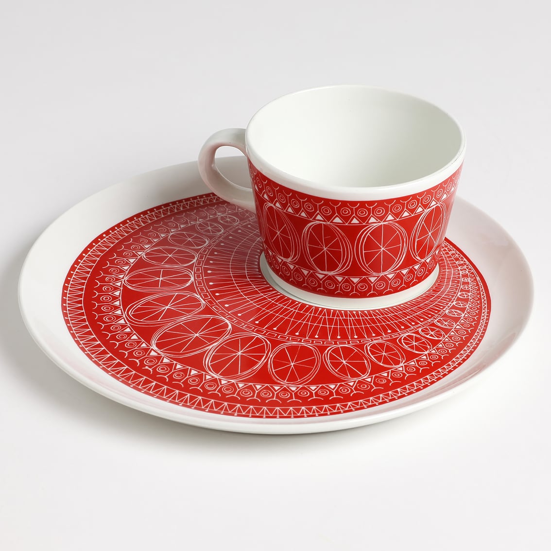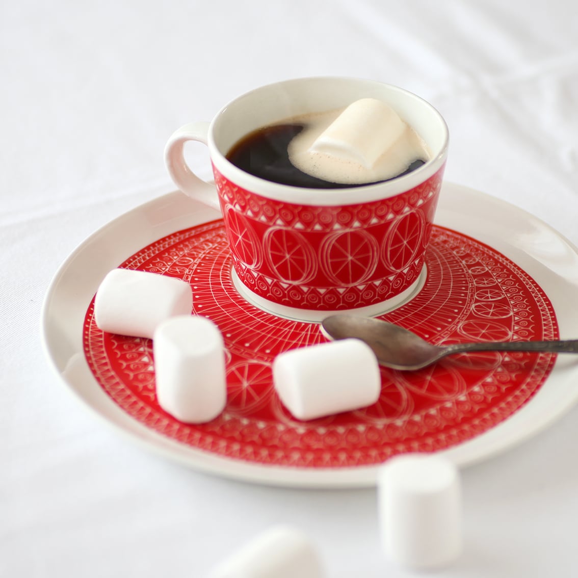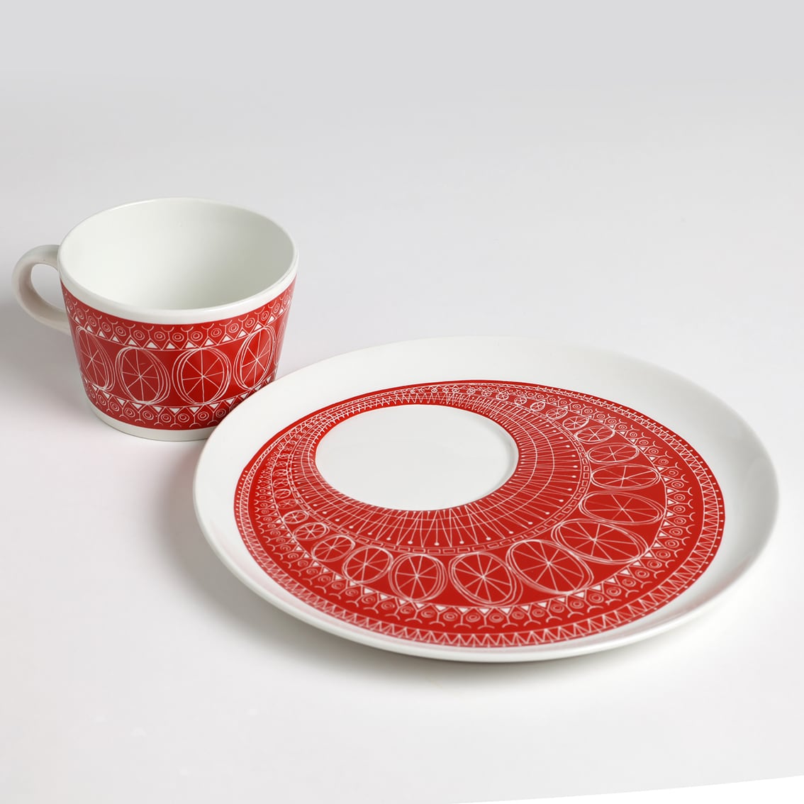 プレートにコーヒーカップとお菓子を載せてテレビ鑑賞を楽しむ、いわゆる《TVカップ》。テレビが家庭に普及した1960年代のフィンランドで人気を博しました。リーキンクッコは赤の他にブルーとブルーパープルも作られています。フォルムデザインはKaj Franck(カイ・フランク)、デコレートデザインはRaija Uosikkinen(ライヤ・ウオシッキネン)。数々の名作を世に送り出したゴールデンコンビは、Emilia(エミリア)シリーズでもTVカップを制作しています。