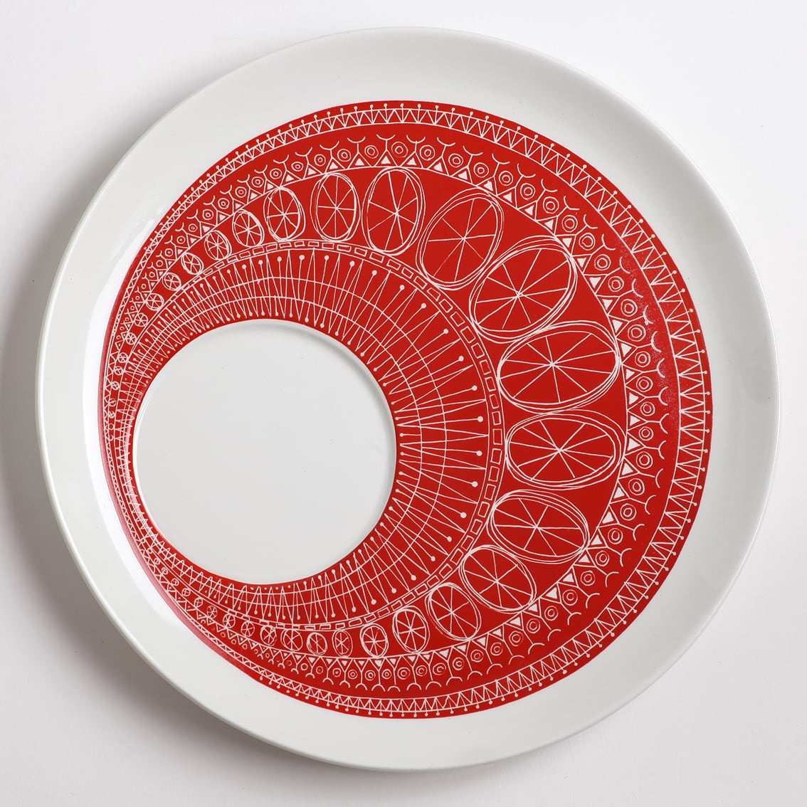 リーキンクッコはフィンランド語で孔雀。孔雀が羽を広げたような幾何学模様のカップ&スナックプレートです。