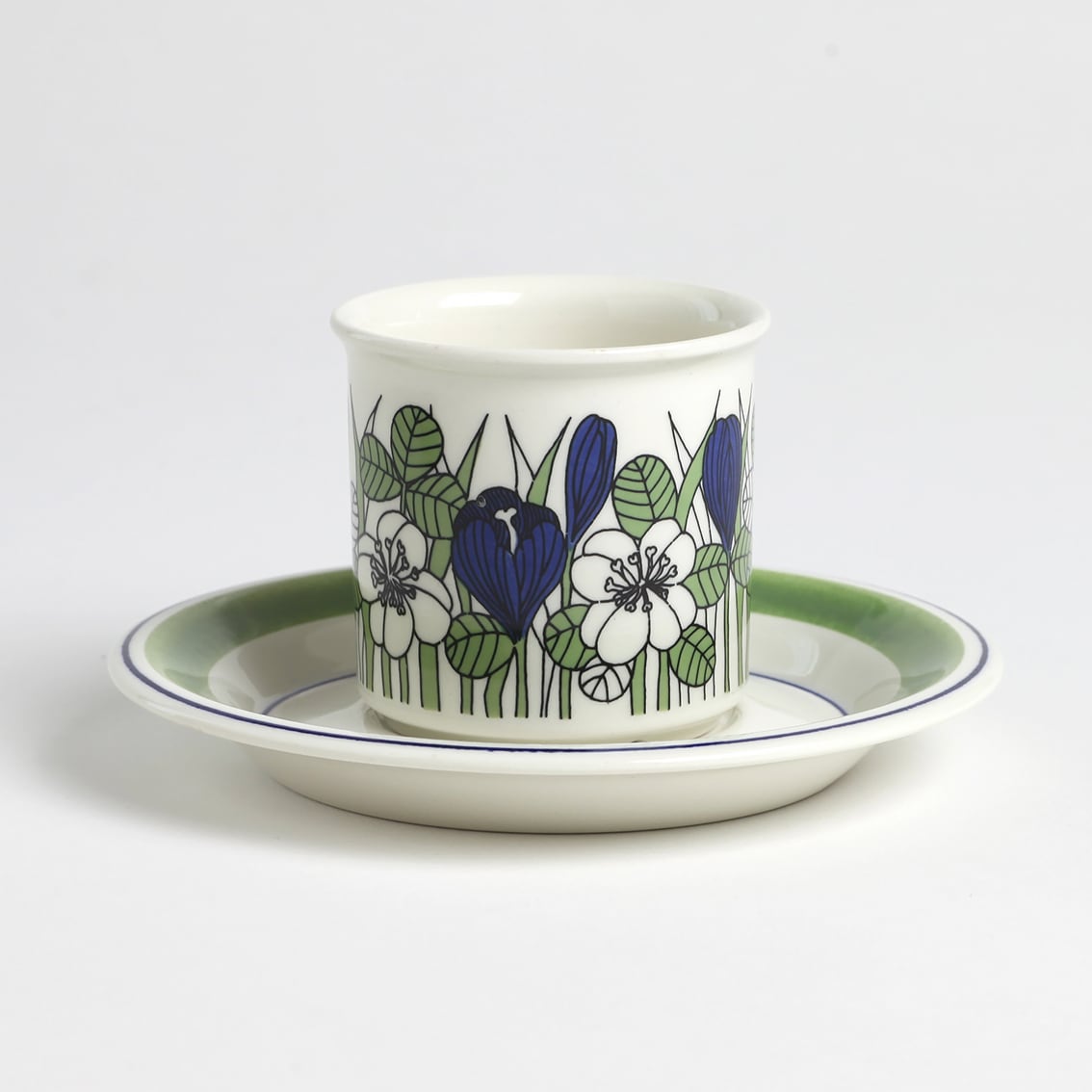 フィンランドARABIA(アラビア)Krokus(クロッカス)のデミタスコーヒーカップ&ソーサーです。花柄のデザインで有名なEsteri Tomula(エステリ・トムラ)の作品の中でもとくに人気の高いクロッカスシリーズは、黒い線画のBWバージョンとこちらのカラータイプがあります。描かれているのはフィンランドの冬に終わりを告げるクロッカスの花とつぼみ。先の尖った細い葉がクロッカスで、丸い葉はクローバーでしょうか。トムラの描く可憐な草花は生命力にあふれ、春の歓びが感じられます。フォルムデザインはPeter Winquist(ぺテル・ウィンクヴィスト)。大変人気のシリーズで現在同じ絵柄をあしらったマグカップやお皿などの復刻版が制作されていますが、カップ&ソーサーはヴィンテージのみ。生産期間が2年間のみの希少なシリーズです。生産期間が2年間のみの希少なシリーズです。