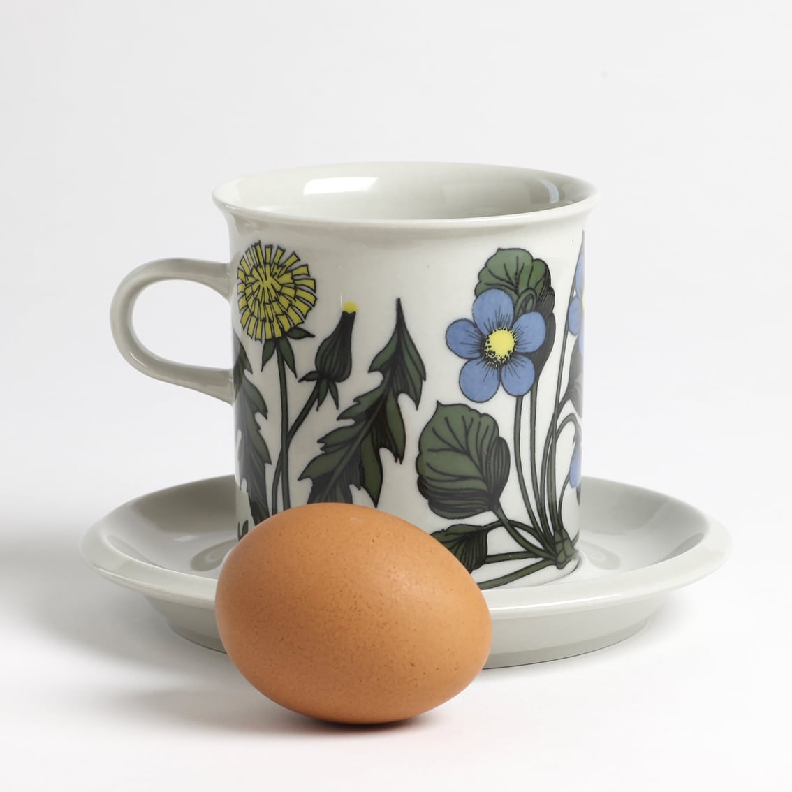 フィンランドARABIA(アラビア)Flora(フローラ)のちょっと大きなマグカップ&ソーサーです。花柄のデザインで有名なEsteri Tomula(エステリ・トムラ)の代表作の一つで、すみれ、タンポポ、すずらん、サクラソウなどが描かれています。彼女の絵のタッチがそのまま活かされたシリーズで優しく素朴な味わいが魅力です。フォルムはUlla Procope(ウラ・プロコペ)によるSモデル。生産期間が2年と短く入手が難しいシリーズです。