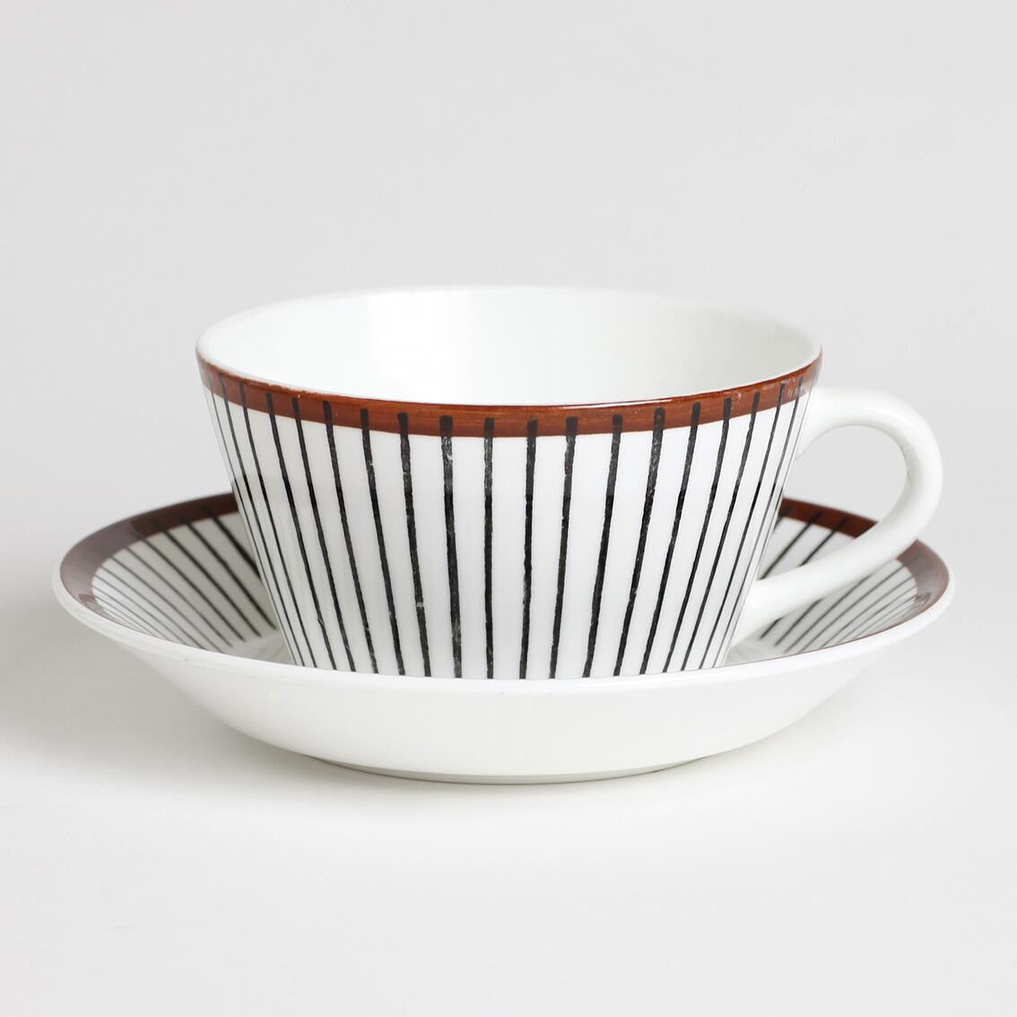 Spisa Ribb(スピサ・リブ)はショコラカラーの帯と黒のストライプのデザインが美しいStig Lindberg(スティグ・リンドベリ)の数ある傑作の中でも特に有名なシリーズです。リンドベリが1940年代に制作したFajans(ファイアンス)シリーズにほぼ同じデザインがありますが、そちらは黒一色で構成されていました。縁の色をショコラカラーにしたことで柔らかさとよりノーブルな魅力が加わったようです。大変人気のシリーズで現在カップ&ソーサーのみ復刻版の製造販売がされていますが、こちらは1955-74年に制作されたビンテージの100mmティーカップ&ソーサーです。