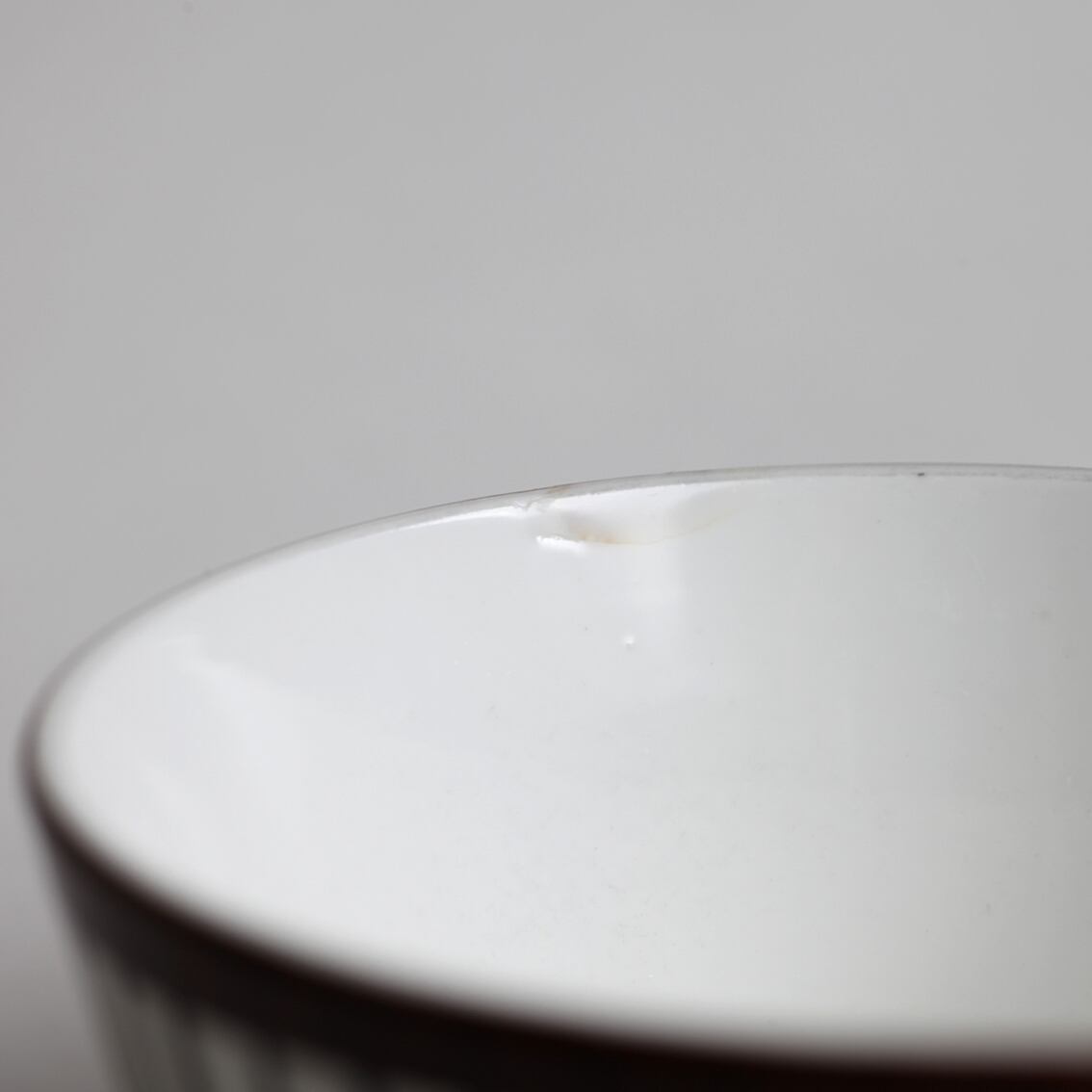 Spisa Ribb(スピサ・リブ)はショコラカラーの帯と黒のストライプのデザインが美しいStig Lindberg(スティグ・リンドベリ)の数ある傑作の中でも特に有名なシリーズです。リンドベリが1940年代に制作したFajans(ファイアンス)シリーズにほぼ同じデザインがありますが、そちらは黒一色で構成されていました。縁の色をショコラカラーにしたことで柔らかさとよりノーブルな魅力が加わったようです。大変人気のシリーズで現在カップ&ソーサーのみ復刻版の製造販売がされていますが、こちらは1955-74年に制作されたビンテージの100mmティーカップ&ソーサーです。
