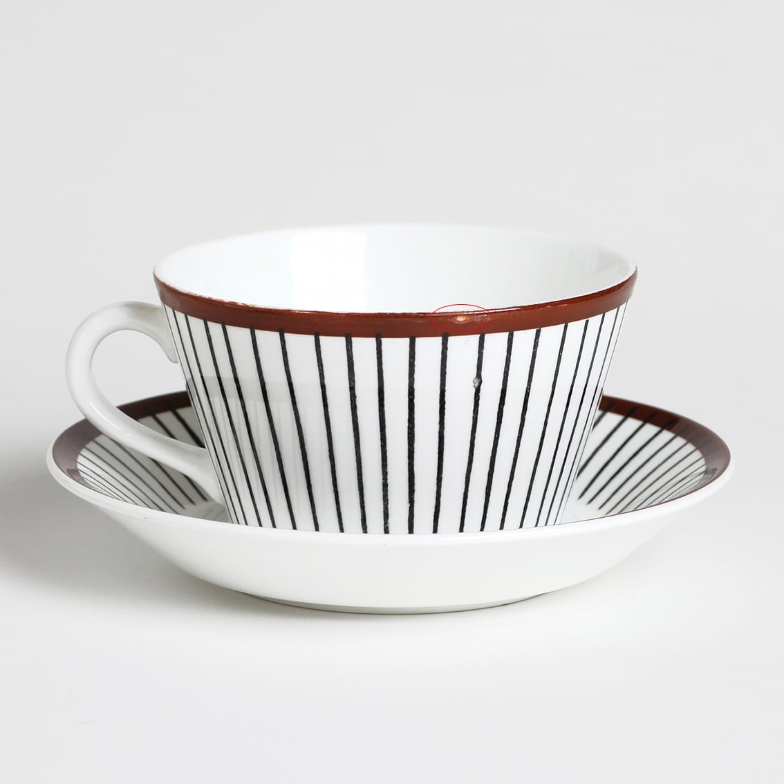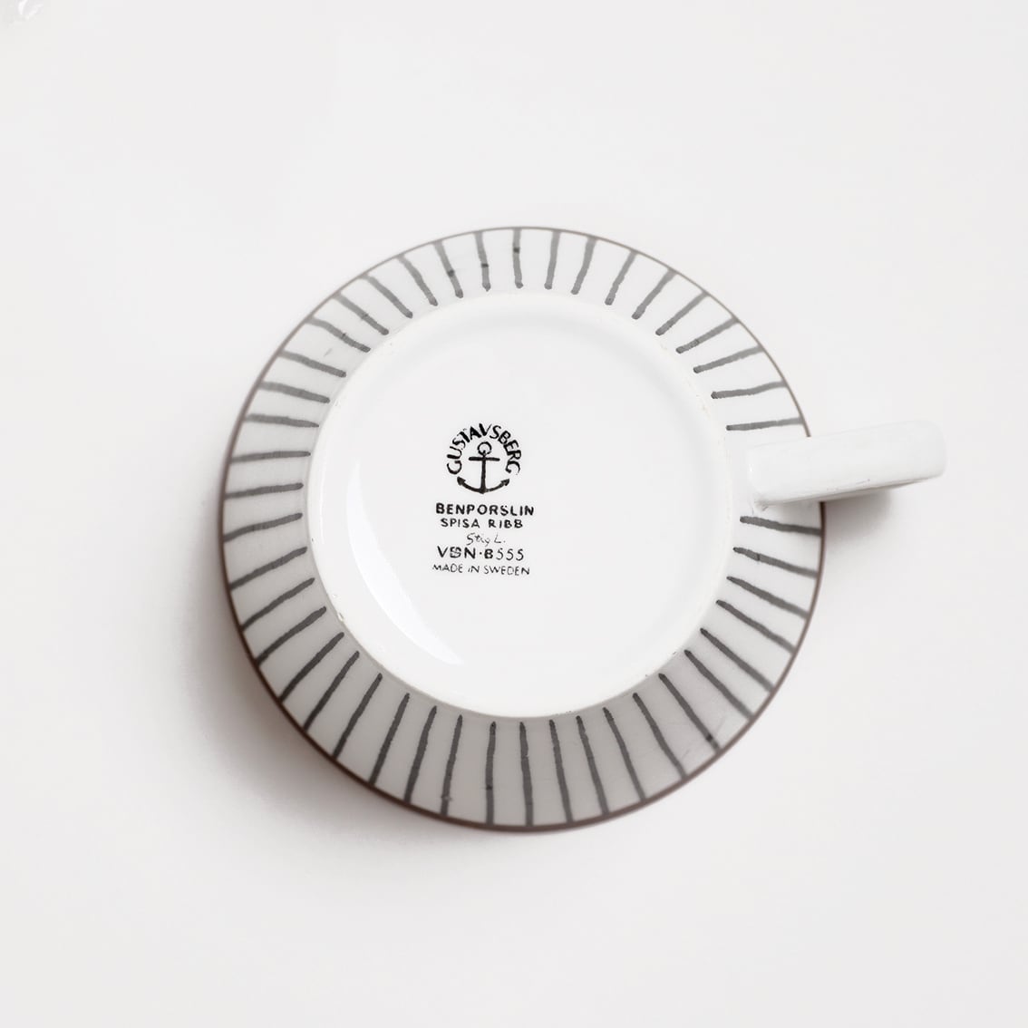 Spisa Ribb(スピサ・リブ)はショコラカラーの帯と黒のストライプのデザインが美しいStig Lindberg(スティグ・リンドベリ)の数ある傑作の中でも特に有名なシリーズです。リンドベリが1940年代に制作したFajans(ファイアンス)シリーズにほぼ同じデザインがありますが、そちらは黒一色で構成されていました。縁の色をショコラカラーにしたことで柔らかさとよりノーブルな魅力が加わったようです。大変人気のシリーズで現在カップ&ソーサーのみ復刻版の製造販売がされていますが、こちらは1955-74年に制作されたビンテージの100mmティーカップ&ソーサーです。