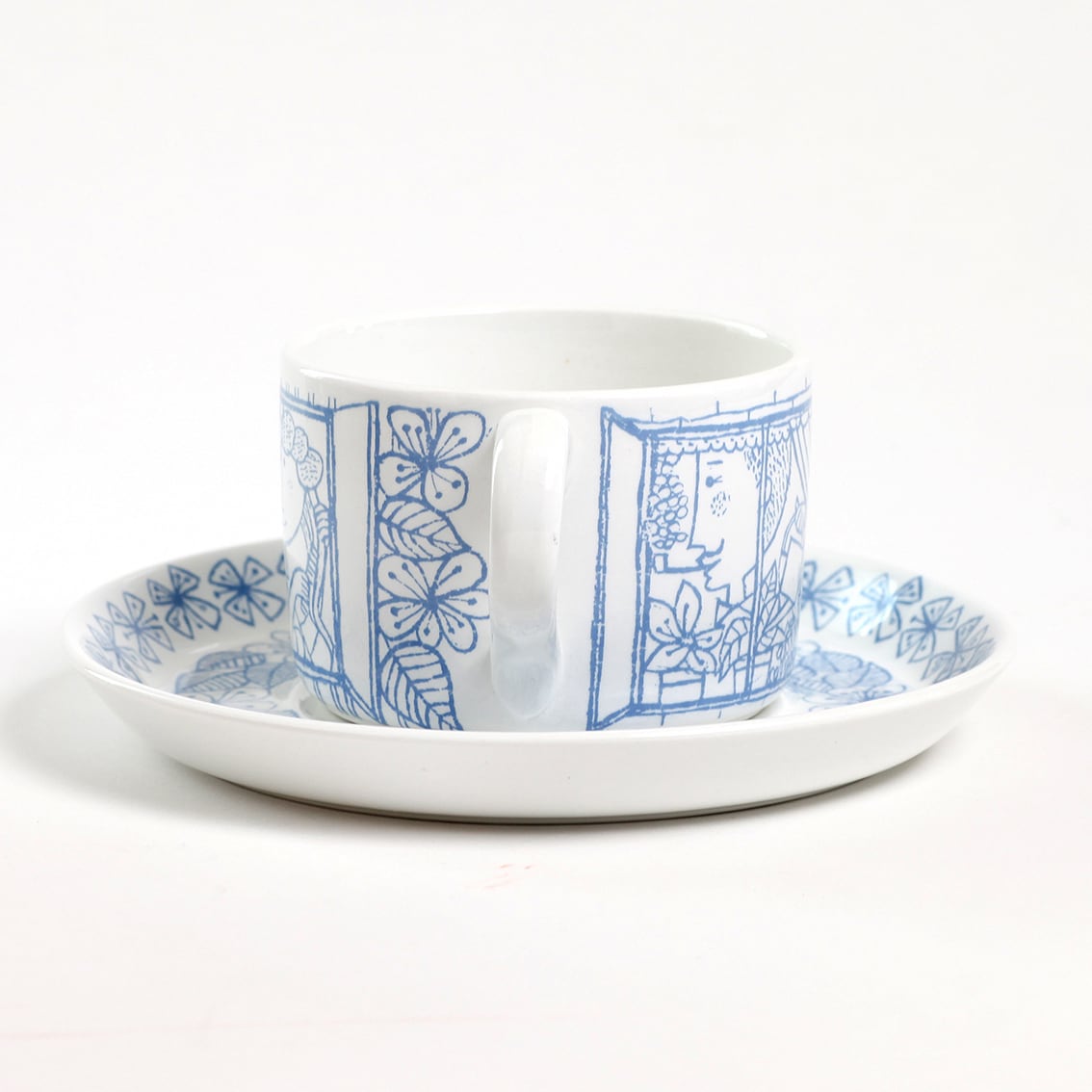 こちらはティーカップ&ソーサー。カップには窓辺の人々が、ソーサーには花とハート模様が、優しいブルーラインで描かれています。底面には一般的にリンドベリのアート系の作品にのみ入る「StigL」のサインがあり、リンドベリの思い入れが感じられます。