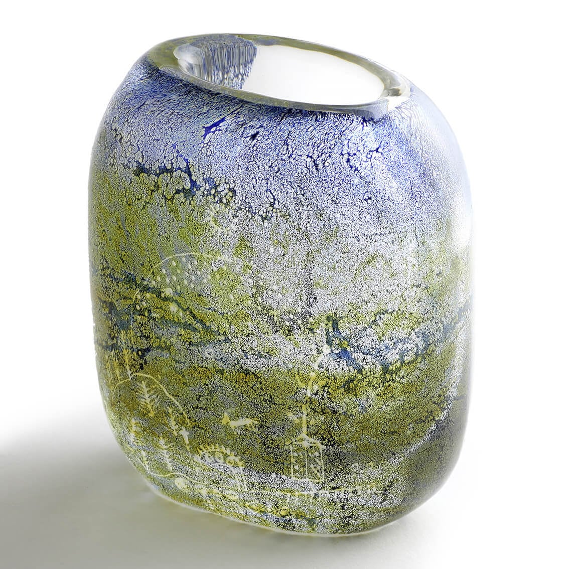 オリーブ色と青でけむるように彩色されたアートガラス。正面には白いエッチングでラップランドの風景が描かれています。太陽は低く昇り、丘のふもとには木々、建物、動物などが点在。絵の素朴なタッチは最果ての地に暮らすサーミの人々に伝承されてきた図像を彷彿とさせます。